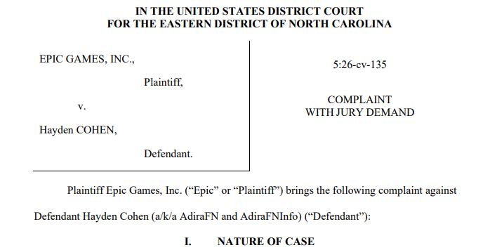 被誉为国外玩家心中的全知大神的舅舅党实际上并不安全,日前Epic Games宣布,正式起诉一名《堡垒之夜》知名舅舅党,经取证该人为公司前员工,涉嫌多次匿名泄露《堡垒之夜》未公开的机密游戏情报。 ·据悉,被告原名海登·科恩,经常使用化名AdiraFNInfo,在热门SNS平台多次泄露《堡垒之夜》未公开的机密游戏情报,主要包括联动信息等。 ·据悉,Epic官方曾在2025年9月11日与海登·科恩签订了相互保密协议(NDA),作为次席制作人可以调取公司的联动IP计划等机密情报。 不过被告为了提升个人知名度以及流量,在2026年1月到2月期间多次在X以及Discord等平台散播《堡垒之夜》未公开的机密游戏情报,严重影响公司与合作伙伴的信用关系。 |