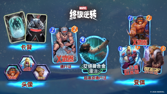 2026年3月5日,《漫威终极逆转》S20赛季「X武器」震撼登场!新赛季将为探员呈上海量全新内容,包括新赛季通行证、全新赛季卡牌和卡包、战场外观、区域和图鉴等。 【赛季通行证】 购买【X武器】赛季通行证,就可以获得全新的角色「X武器 」。随着通行证等级的提升,还可以解锁全新变体、头像、卡背和其他资源。 另外,购买超高级赛季通行证,即可获得「艾德曼合金灌注」变体,得到变体时会同步获得基础卡。 对于没有购买超高级赛季通行证的探员,「艾德曼合金灌注」的基础卡可以通过合成或SNAPPACKS获得。 「X武器 」 [2/2] 你的1张其他卡牌被删去或丢弃后,金刚狼战力+1。每隔3次,此效果提高1。(0/3) 注意: 本赛季是我们推广双轴玩法的第一个赛季,特别推出狼叔粉丝服务!为了让更多的丢弃和删去组合可以得以发挥。 金刚狼包括:【金刚狼】、【X-23】和【戴肯】 「艾德曼合金灌注」变体 [4/0] 揭示:在此区域复活1张你被删去的战力最高的卡牌,并使其战力翻倍。 【赛季新卡】全新卡牌每周限时登场 系列5新卡 系列5赛季全新卡牌可以在终极宝库、SNAPPACKS、合成获得。 1.第一周 3月5日9点~3月12日9点 「幽禁」终极卡包 [2/3] 激活:你在此区域和手牌中每有1张能量消耗为5或更高的卡牌,战力+2。 2.第二周 3月12日9点~3月19日9点 「独行客」终极卡包 [3/3] 激活:使你放置的下一张卡牌获得等同于这张卡牌的战力。 3.第三周 3月19日9点~3月26日9点 「H武器」终极卡包 [7/14] 被丢弃时:此牌回到手牌,能量消耗-2。 4.第四周 3月26日9点~4月2日9点 「白幽灵」终极卡包 [4/6] 激活:若你之前有卡牌被弃丢或删去,使敌方每个区域的前排卡牌战力-1;若你之前有卡牌被丢弃和删去,则此效果翻倍。 5.第五周 4月2日9点~4月9日9点 「极光」终极卡包 [6/7] 揭示:使你在每个区域中的1张其他揭示卡牌战力+2。接着对持续、激活和回合结束卡牌重复此效果。 系列4新卡 系列4新卡可以通过SNAPPACKS、合成定向获得;终极宝库中抽到系列4卡牌时也有概率获得新卡。 第三周 3月19日9点后开放 「激髓」 [1/0] 被丢弃或删去时:将-6战力随机分配给敌方卡牌。 【往期UP】时空卡包限时返场 1.第一周 3月5日9点~3月12日9点 「多玛姆」时空卡包 [7/11] 对战开始:开始召唤仪式。(将第一阶段添加到手牌。) 召唤仪式 2.第二周 3月12日9点~3月19日9点 「伽娜塔」&「复制猫」时空卡包 「伽娜塔」 [4/5] 每回合你另一个区域的放置的第1张卡牌揭开时,使该卡牌战力+3。 「复制猫」 [3/5] 当你抽到此牌时,偷取对手卡组中最底部卡牌的文字。 3.第三周 3月19日9点~3月26日9点 「亡刃将军」时空卡包 [3/5] 揭示:丢弃2张手牌,你的最大能量+1。 4.第四周 3月26日9点~4月2日9点 「惊奇男孩」&「瑟西」时空卡包 「惊奇男孩」[3/1] 回合结束:使你3张初始能量消耗为1的卡牌战力+1。 「瑟西」[5/7] 揭示:若可能,将你在此牌所在区域的其他角色牌随机转变成能量消耗+1的牌。 5.第五周 4月2日9点~4月9日9点 「反毒液」时空卡包 [4/7] 揭示:将你卡组最上方卡牌的能量消耗和战力均设为0。 【战场外观】 星空迷航:回到家园 使用【高级星空币】即可开启探索,当你集齐了当期的「战场背景」,「区域外框」,「头像框和名称栏」和「能量球」4个战场外观后,你将直接获得整个星盘上剩余的所有道具奖励(整个星盘总计有15000星尘徽章、16000点数和12个高级边框等奖励)。 除此之外集齐当前大奖还可以增加奖励加成(强化因子、联盟任务积分和限时任务加成)。 幽灵秘境通行证 完成通行证任务提升通行证等级,解锁【星尘徽章】和【高级星空币】等奖励,若您选择购买通行证,更能解锁 Mega 分离因子、战场背景等专属奖励。 【星尘徽章】可以兑换【高级星空币】、名称栏、高级神秘变体、神秘变体、Mega分离因子和边框等奖励。 【限时模式】 1.团队对决 团队对决是一种全新的游戏模式,玩家可以指挥一支由自己喜爱的角色组成的团队。该模式共有五支团队,每支团队都拥有专属效果,由此打造出全新的阵容协同与战术打法。全新的团队技能,可借助同团队的成员联动,发挥出每支团队的强大效果。 此外,每支团队中的六位核心角色,都拥有各自独有的全新效果。当你在角色名字上方看到 “团队对决” 标志,且卡牌带有独特的 “团队对决” 边框时,即代表该角色拥有 “团队对决” 模式的专属全新效果。隶属于同一团队的角色,其卡牌左上角会标注对应的团队标志。 活动时间: 2026年3月17日 9点~2026年3月31日 9点 团队对决任务 完成团队专属任务,赢取更多徽章和经验值!玩家将接到不同难度的任务,完成后可获得 10、20或40个徽章和经验值。玩家初始将获得6个任务。任务每8小时刷新一次,也可以使用金块更快刷新。 团队入场券 参与团队对决对战,每场需消耗 1 张团队入场券,获胜即可返还该入场券。模式上线后,每位玩家初始拥有 6 张入场券。自首次进入团队对决起,每 8 小时可自动领取 4 张入场券,数量达到12 张后,将不再自动补充。 活动通行证 购买价格:1200金块 奖励一览 活动商店兑换和通行证 吞星·初露锋芒 [6/12] 你打出的下一个角色牌将成为我的使者!回合结束:若我的使者所在区域领先,我将战力+2。(若已在手牌或已在场上揭示) 快球特攻 法术 [2/0] 揭示:删去你在此区域战力最高的1张卡牌,使此区域的1张敌方卡牌减少等量的战力。 