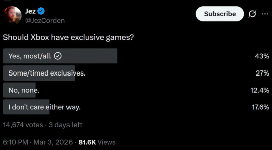 Xbox很早就放弃了独占策略,从2024年起全面开放了多平台发行,至今旗下所有第一方IP都已经登陆了竞争对手PlayStation平台。然而,随着Asha Sharma接任Xbox新任掌门,其让“Xbox回归”的寻求也有着很大的群众基础。 据外媒游戏记者Jez Corden的一份个人调查(超1.4万人参与投票),43%的玩家支持Xbox推出独占游戏。另有27%的玩家支持限时独占。只有12.4%的玩家不希望Xbox有独占。这意味着70%的玩家倾向于Xbox有独占游戏。 这项民意调查清楚表明,粉丝仍然希望Xbox回归传统的运营模式,而非今天的全平台策略。 对于Xbox今后是否会回归独占游戏,Asha Sharma当前的态度比较模糊。她先是重申当前的多平台策略暂时不会改变,仍计划将旗下第一方游戏在更多平台推出,但将来不排除任何可能性,暗示有回归独占的可能。 今天的这份民意调查,至少让Xbox今后船大调头有了强大的舆论基础。 随着Xbox新世代主机的逐渐揭晓,新任CEO Asha Sharma是回归传统的硬件+独占模式,还是继续延续前任CEO和高管们大力推行的Game Pass订阅和多平台策略,让我们拭目以待。 值得一提的是,正是Game Pass订阅和多平台策略导致前任CEO斯宾塞和Xbox黑人女总裁邦德被迫辞职,Xbox的内部改革势在必行,这名被空降的印度裔女掌门Asha Sharma可能正是适合这一重任的不二人选。 |