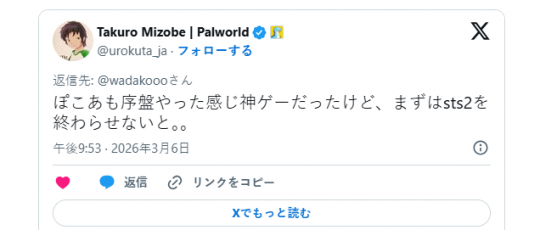 ·《幻兽帕鲁》社长溝部拓郎盛赞《杀戮尖塔2》是神游戏,称与同事约好了公司开会却沉迷游戏不想去,逼得同事只能跑到自己的X账号上提醒该工作了,当然同事也深知老板已经沉迷了这款游戏,提议是否需要自己把老板的Steam Deck没收来阻止继续沉迷。