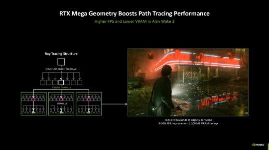 近日英伟达官方宣布,《巫师4》将采用全新的RTX Mega Geometry技术,带来更高的帧率与更低的显存占用。 英伟达在采用Blackwell架构的RTX 50系显卡中,引入了RTX Mega Geometry全新技术。RTX Mega Geometry虽然是一项独立技术,但实际上是与DLSS 4.5深度协同的。在渲染管线处理的流程中,会先通过RTXMegaGeometry完成压缩/缓存数百万三角形,然后在交给路径追踪,完成光线遍历,最后才是DLSS 4.5多帧生成,完成光流和AI重建高帧率画面。 NVIDIA现场展示了《巫师4》游戏场景,高密度植被场景中包含数百万片树叶,对于传统渲染方式除了笑看显存爆满、帧率降低,已没有太多办法。而换成DLSS 4.5搭配RTX Mega Geometry,如此宏大的场景就能轻松实现,视觉效果也相当震撼。 RTXMegaGeometry可在所有RTX显卡上运行,但Blackwell架构拥有专属技术,可进一步加速该特性。这项技术首次应用于《心灵杀手2》,Remedy在其自研的Northlight引擎中加入英伟达RTXMegaGeometry技术。开启后,游戏帧率提升5%~20%,同时节省300MB显存。Remedy还将在《控制:共振》中继续使用该技术,本作已确认支持DLSS 4.5与路径追踪技术。 《巫师4》也将使用全新的RTXMegaGeometry技术,并结合一套正在开发中的全新植被系统。利用RTXMegaGeometry的结构化分区技术,系统每帧只会更新那些对视觉产生关键影响的部分,从而极大降低光线追踪管线的负担。而OpacityMicromaps技术则让叶片等复杂物体的透光计算更高效,进一步加速光线追踪。 这两项技术突破结合,让高精度路径追踪资源能以流畅游玩的帧率运行。在演示中可以看到一段无人机视角下极度茂密的森林:植被由高精度资源、数百万个物体构成,光照与阴影效果精准,即使在极远距离下依然清晰。 |