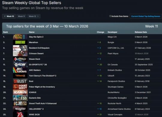 Steam2026年最新一周游戏销量排行榜出炉(2026年3月3日-2026年3月10日,无免费游戏),本周经典卡牌肉鸽续作《杀戮尖塔2》正式发布,打破了《生化危机9》的三连冠,成功夺冠,除此之外,即将发布的3A大作《红色沙漠》预购人数火爆,获得了第四名的好成绩,之后还有诸多大作回归榜单,让我们一起来看看具体前十名有哪些佳作吧! 01.《杀戮尖塔2》 02.《失落星船:马拉松》 03.《生化危机:安魂曲》 04.《红色沙漠》 05.《EA SPORTS FC? 26》 06.《ARC Raiders》 07.《全境封锁2》 08.《Rust》 09.《Poker Night at the Inventory》 10.《翼星求生》 |