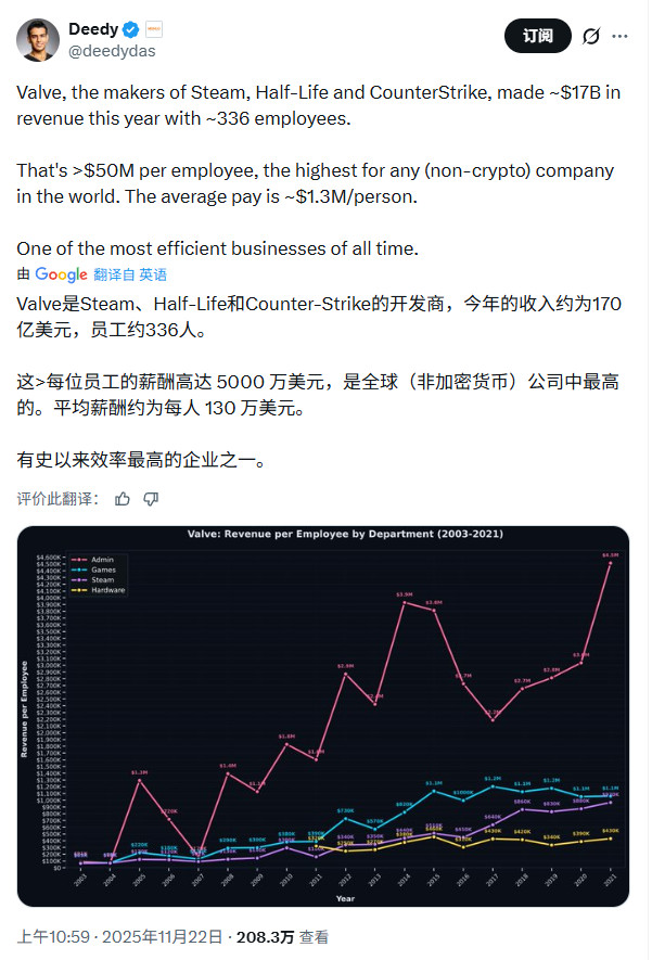 虽然Steam的抽成政策往往成为被批评的对象,但数据显示越来越多的游戏在Steam上取得了成功。 在GDC游戏开发者大会上,Valve透露2025年Steam平台有5863款游戏销售额超过10万美元。这一收入增长的一个重要原因是Valve在该平台上开启的折扣促销,共有860万用户通过每日特惠购买了游戏。 此外,Valve还表示,通过促销活动和其他相关折扣购买游戏的用户数量比正常价格购买游戏的用户数量高出125%。 正如之前所报道的,独立游戏的销售在这一成功中发挥了重要作用,2025年Steam超过25%的收入来自独立游戏,其中包括《空洞骑士:丝之歌》和《REPO》等热门作品。 然而,事情还有另一面。尽管有大量游戏获得了丰厚的利润,但还有超过5000款游戏甚至连100美元都没有赚到,垫底的30%总共只获得了37美元利润。 2025年12月是Steam有史以来收入最高的假日月份,销售额超过16亿美元。与2024年12月相比,该平台收入增长了惊人的22.7%。 第三方统计机构发布的2025年圣诞假期期间(12月21日-1月5日)Steam上最畅销游戏排名。这份榜单既有3A大作,也有3A和小型独立游戏 1.《Arc Raiders》,120万 2.《底特律:变人》,99.3万 3.《Peak》,77.9万 5.《战地6》,70.6万 6.《R.E.P.O》,66.6万 7.《杀戮尖塔》,59万 总而言之,Valve在2025年的表现,在整个游戏公司中几乎无人能及,而Steam高达162亿美元的营收,也成为这一辉煌成绩的重要支柱。 随着Steam Machine仍有望在未来推出,Valve很可能迎来又一个打破纪录的年份——前提是当前的内存危机能给他们一点喘息空间。 |