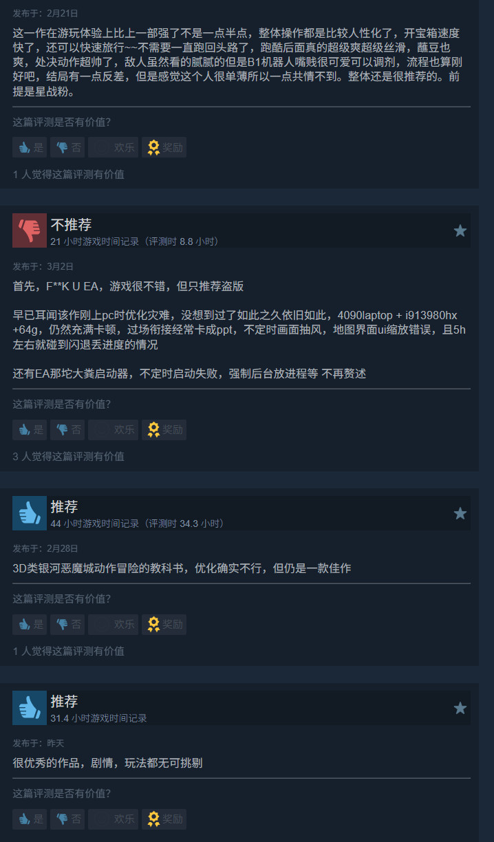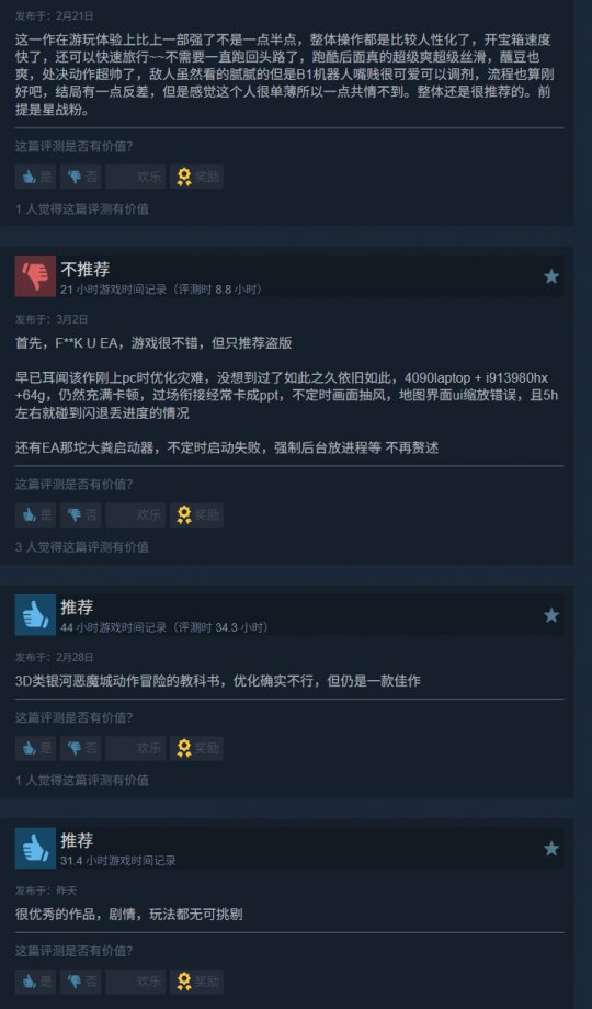 近日,EA在Steam开启春季畅玩特卖活动,重生工作室打造的《星球大战绝地》系列第二款游戏《星球大战绝地:幸存者》开启新史低促销。标准版原价298元,目前1折,仅售29.8元,为新史低,此前的史低价为35.76元。 除了标准版外,豪华版也在1折促销。原价418元,现价仅41.8元。 《星球大战绝地:幸存者》豪华版可解锁以《星球大战:新希望》中的汉·索罗?,及卢克·天行者为设计灵感的专属外观。 “银河英雄”外观组合包包含: “无赖”外观 “坚固”BD-1 外观 “DL-44”爆能枪套组 “新英雄”外观组合包包含: “义军英雄”外观 “BD-宇航”BD-1 外观 “义军英雄”光剑套组 《星球大战绝地:幸存者》在首发时有着严重的性能问题,该作于2023年4月28日发售,至今快3年了,但性能问题依旧存在,导致该作的Steam中文区评价偏低,为“褒贬不一”。 有玩家反映他的4090笔记本仍然卡顿,过场衔接经常卡成ppt。但也有人指出,“早期的优化问题在2026年的今天基本可以忽略了,闪退问题通过增加虚拟内存就能大概率避免。”所以优化这个问题,真是有点仁者见仁智者见智的感觉了。 |