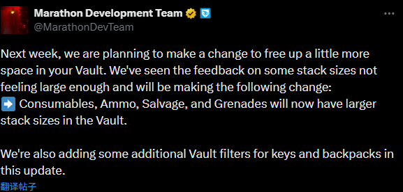 尽管没有达到发售前的最佳预期,不过Bungie工作室在《马拉松》发售前后始终保持对玩家反馈做出了极为迅速的响应态度,今天,官方发布下周上线的新更新改动预告,其中被收玩家诟病的仓库收纳容量严重不足问题将得到明显改善。