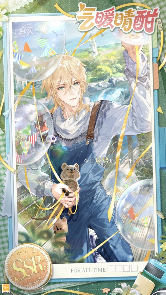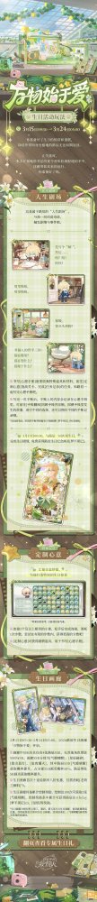 【2026路辰生日活动「万物始于爱」PV公开】 视频: 2026路辰生日活动「万物始于爱」于2026年3月15日09:30开启。见证令一切萌芽的契机,见证一份爱。 【路辰SSR·气暖晴酣】 「今日运势是, “意外之喜”。 」 3月15日09:30 - 3月24日05:00,路辰生日活动「万物始于爱」活动卡池限时开启,路辰SSR[气暖晴酣]获得概率提升。 [气暖晴酣]突破后为横幅动态卡面,可设置为开屏界面。 [气暖晴酣]配备卡组剧情: 这一年的路辰,宛如一只小狐狸,还不会用胡须感知外界,只能用爪子去碰,用鼻子去嗅闻。 他不会轻易动摇,即使常常念旧,偶尔遗憾。 然后把命运当成一阵风,等它迎面撞来,路辰就学会乘着一阵风飞起来了。 【路辰Birthday纪念·梦不须记】 「因为是你,等待的每一秒都会变成值得期待的瞬间。 」 3月15日09:30 - 3月24日05:00,参与路辰生日活动「万物始于爱」,在生日当天与他共度,完成剧情即可免费获得1张生日纪念画灵[梦不须记]。 [梦不须记]为特殊互动画灵,触碰不同区域,可触发动作或语音。 【万物始于爱·路辰的私人空间】 3月15日09:30起,路辰的私人空间[拾光漫迹]上线。获取后,[校园]-[私人空间]将解锁相应地图。 【万物始于爱·活动玩法及福利一览】 活动时间:3月15日09:30 - 3月24日05:00,参与路辰生日活动「万物始于爱」,可免费获取: Birthday纪念互动画灵、小小路辰生日限定服装、生日限定闹钟皮肤、专属情头、生日限定Q版头像、[老荷兰颜料]*3、[补签券]、个人信息档案等奖励。 【万物始于爱·路辰生日服装】 “想好待会出场时,挽我哪边的手了吗?” 3月15日09:30 - 3月24日05:00,路辰生日活动期间,生日限定服装[皎镜]、[新苔]限时上架,可通过购买服装礼包获取。 【关于《时空中的绘旅人》】 《时空中的绘旅人》活动「万物始于爱」3月15日开启! 参与游戏体验活动,海量福利等你开启。 《时空中的绘旅人》官方网站:hlr.163.com 《时空中的绘旅人》官方微信:时空中的绘旅人 《时空中的绘旅人》官方微博:时空中的绘旅人 《时空中的绘旅人》官方群:632719634 |