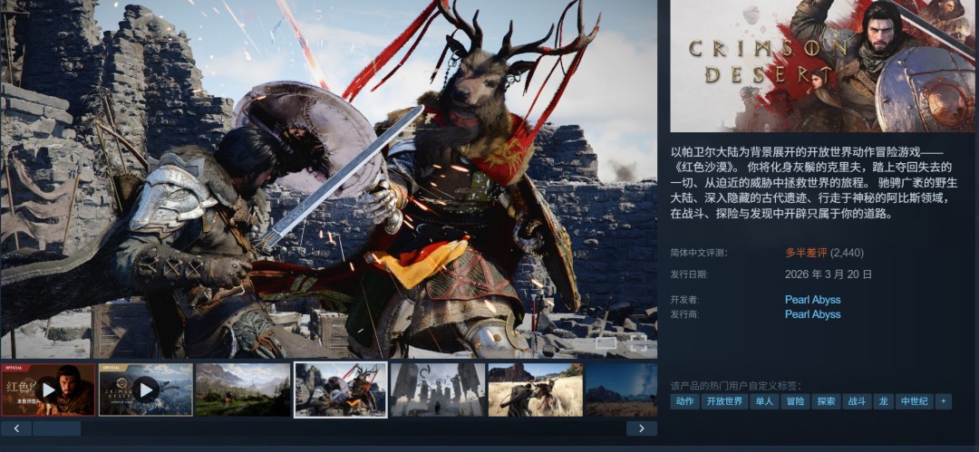 《红色沙漠》官博宣布,《红色沙漠》发售24小时内全球累计销量达到200万套。 PearlAbyss还表示,他们正在关注粉丝们反应的问题,正根据社区的反馈努力对《红色沙漠》进行快速更新和改进,以便玩家能接下来的冒险旅程更加精彩、愉快。 官博: “《红色沙漠》全球累计销量达到两百万份 很开心可以跟各位一起共享这么有意义的一刻。衷心感谢所有与我们一同踏上帕卫尔大陆的玩家与社区的伙伴们。我们将持续倾听社区的多样反馈,并快速推进优化与改进,竭尽所能让各位玩家接下来的冒险旅程更加精彩、愉快。” 考虑到《红色沙漠》在登上全球畅销榜榜首后,仅通过预购就在Steam平台售出了40万份,这些数字其实并不令人意外。这款动作冒险游戏在所有平台上都获得了超过300万玩家的愿望单,而这股热潮似乎也转化为了实际的销量。 简体中文评价已降至“多半差评”: |
