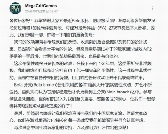 《杀戮尖塔2》首个更新上线后,影响了玩家们已熟悉的流派和体系,导致要付出更多时间成本去学习新的体系,也影响了游戏体验,因此引发了国内外无数玩家的差评和质疑,Steam简中好评率更是狂跌。 近日开发商MegaCrit在B站官方账号下用中文回应了玩家质疑,并承诺会认真考虑中国玩家的建议。官方表示:“虽然语言障碍让我们很难直接与我们的中国玩家交流,但请大家放心,你们在游戏里通过F2提交的每一条建议我们都能看到并且会认真考虑。再次感谢中国社群玩家们的支持,以及你们为社区作出的贡献!” 官方表示此次更新的平衡性调整只是“长跑的起点”,未来1-2年里这类更新会非常频繁。“我们最终的目标是让它拥有和1代一样完美的平衡性。这一过程并非线性的,而是存在着各种来回的调整,且目前的任何改动也并不代表最终结果。 Beta分支(Betabranch)会用来测试各种“脑洞大开”的实验性改动,并会不断迭代,直到我们认为它足够稳定后才会更新到主分支(Mainbranch)之中。参与测试全凭自愿,但你们的加入对我们至关重要。” |