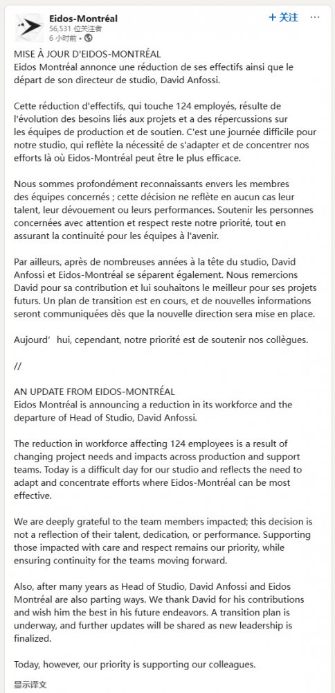 Eidos蒙特利尔的辉煌时期早已过去,这家曾开发《古墓丽影》和《杀出重围》系列的工作室,如今正步履蹒跚,跌至历史最低点。 Eidos蒙特利尔刚刚宣布将裁减工作室124个工作岗位,同时,在该工作室工作了十多年的负责人David Anfossi也将离职。 这并非Eidos蒙特利尔工作室近期首次裁员,去年他们就经历了两轮裁员。甚至有报道称,同期《凯恩的遗产》重启项目也被搁置。 Eidos蒙特利尔曾在2021年推出了《漫威银河护卫队》 Steam特别好评 至于他们目前正在开发的项目,EmbracerGroup曾在2023年计划通过Eidos蒙特利尔和SquareEnix推出5款3A级游戏,并在2028年前完成,但到目前为止,我们还没有看到任何一款游戏推出。 这家工作室之前也在开发一款《指环王》网游,但最近也被取消。现在,他们正在开发一款基于虚幻引擎5的3A级游戏,而且已经确认这款游戏并非《杀出重围》系列。 |