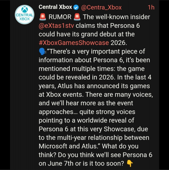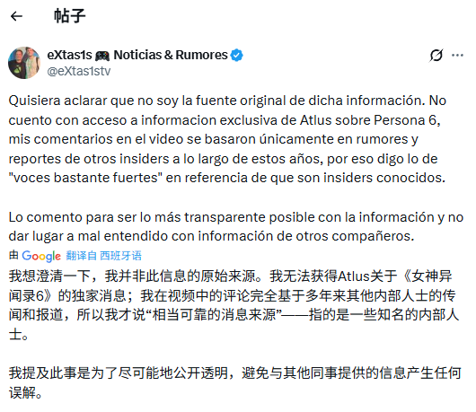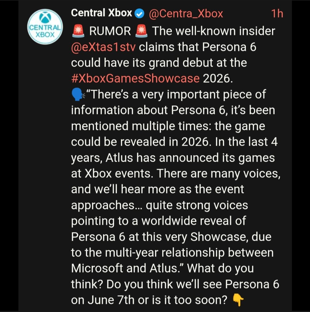近日,关于《女神异闻录6》的发布传闻再度引发关注。据爆料人Extas1s透露,该作有可能在2026年6月7日举行的Xbox游戏展上正式亮相。 Extas1s在其视频中表示,关于《女神异闻录6》有一条非常重要的信息已被多次提及,即该游戏可能在2026年公布。他指出,过去四年间,Atlus一直选择在Xbox活动上公布其游戏作品。随着展会临近,有“相当强烈的信号”指向《女神异闻录6》将在本次展会上进行全球揭晓,这得益于微软与Atlus之间的多年合作关系。此前,世嘉就曾在一场Xbox展会上公布了《女神异闻录3:重制版》。 随后,Extas1s发布声明澄清,自己并非该信息的原始来源,也无法获取Atlus关于《女神异闻录6》的独家信息。他解释称,视频中的评论仅基于多年来其他内部人士的传闻和报道,所谓的“相当强烈的信号”指的正是那些知名内部人士的说法。他表示,此举是为了尽可能保持信息透明度,避免对同行提供的消息产生误解。 截至目前,Atlus及微软官方均未就《女神异闻录6》的发布计划作出任何正式回应。该传闻的真实性仍有待进一步验证。 |