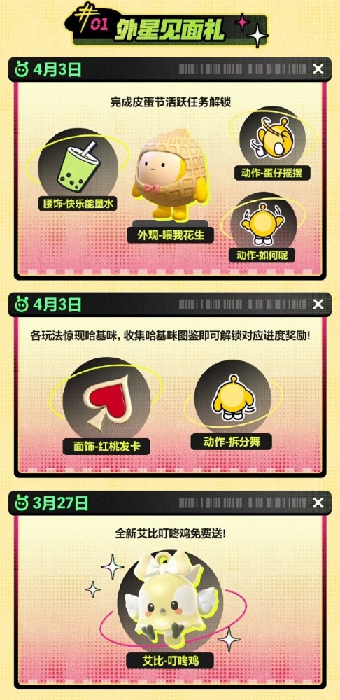 不好了长官!蛋仔岛已被咪咪喵喵入侵!4月3日,国民原创乐园游戏《蛋仔派对》皮蛋节版本「揪出哈基咪」正式开启,全新猫meme外观上线!蛋仔岛、各玩法惊现神秘双揪生物,小心你身边的蛋! 【喵星福利】收集哈基咪图鉴,完成活跃任务,外观、动作等奖励免费领! 【版本上新】哈基咪蛋&蕉皮喵蛋外观、主教手持物等惊喜上新。 【猫咪入侵】各玩法被哈基咪入侵,哈基咪伪蛋、魔性追捕装扮...猫咪已占领蛋仔岛! 4月3日,国民原创乐园游戏《蛋仔派对》皮蛋节版本「揪出哈基咪」正式开启!外星咪占领蛋仔岛,蕉皮喵蛋vs哈基咪蛋,喵咪大战即将开始! 【关于《蛋仔派对》】 咔咔~欢迎光临蛋仔岛!(*?▽?*)《蛋仔派对》是一款拥有5亿玩家的国民原创乐园游戏。在这里,你将化身Q萌的蛋仔,在盲盒机背后的神秘世界——蛋仔岛,展开一段奇妙的闯关之旅。游戏内含上百张风格各异的地图关卡、数十种休闲娱乐玩法,不怕手残,趣味无穷~海量高萌盲盒外观,来邂逅你的心动款!自由度极高的乐园编辑器,助你打造独一无二的乐园地图!更有充满脑洞与想象的蛋仔乐园,集结上亿张玩家原创乐园地图,等你和蛋搭子一同游玩打卡! |