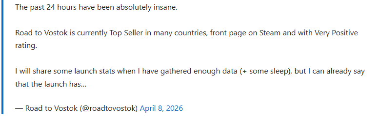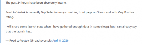 《沃斯托克之路》首发爆火 开发者兴奋表示今后开发预算充足