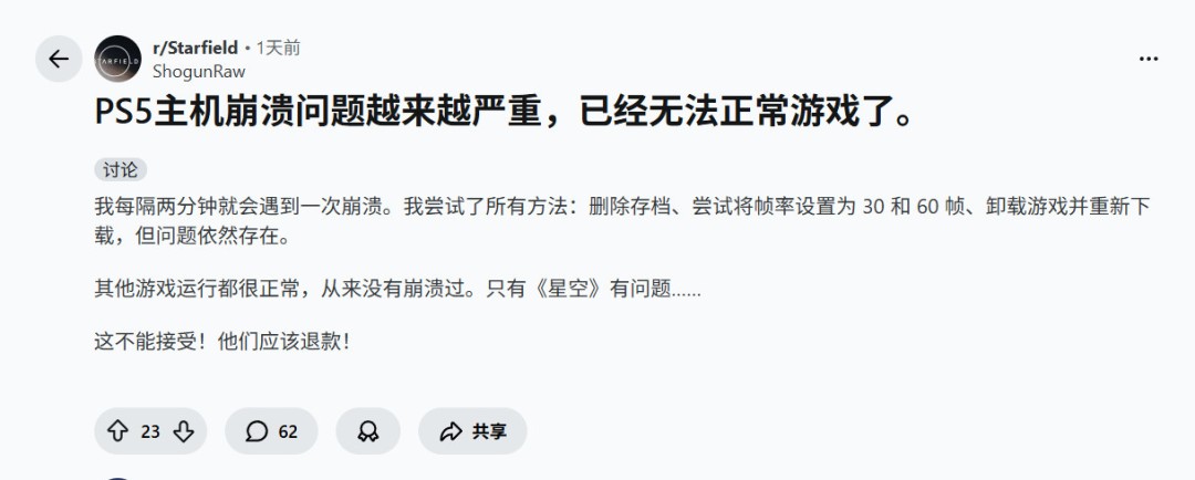 《星空》PS5版频繁崩溃 玩家出现退款潮