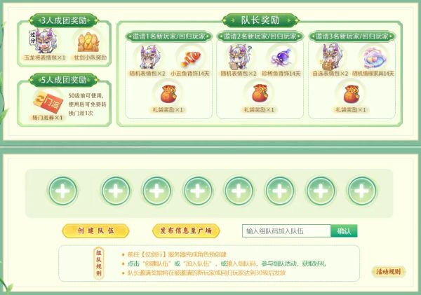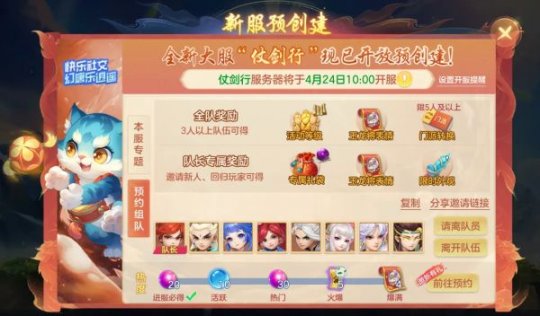 万人大服【仗剑行】预约已开启,入驻【仗剑行】领全新萌宠!组队预约获奖励!新增福利助力相约百级! 新服预创建 预约赠好礼 参与万人大服【仗剑行】预约活动,助力大服热度增长!每阶段均可获得道具奖励,当热度爆满时,还可获取神兽玉龙将表情包! 组队得奖励 参与春季大服组队,达成3人成团、5人成团,可获得玉龙将表情包、转门派券(50级前可使用),以及仗剑小队奖励! 邀请新玩家或回归玩家组队,队长还可根据邀请人数,获取珍稀外观、情缘家具、礼袋奖励! 队长创建队伍后,可选择将组队信息发布至组队广场,少侠们也可前往组队广场快速寻找、加入队伍! 仗剑行大服活动:专属萌宠 全新萌宠鞠小豹将在万人大服【仗剑行】亮相,拥有全新单体物理攻击技能!登录第二天即可免费领取!还有培养活动让少侠们可以轻松养成萌宠! 55级新宠物 角色达55级时将新增神秘新宠,特殊技能将自带“驰援”效果,敬请期待! 仗剑小队 组成多人小队,完成活跃任务提升小队等级获取丰富奖励!参与预约组队还可提前获取小队等级! 升级商店加码 万人大服【仗剑行】服务器等级85级、95级时开放的升级活动商店奖励加码!新增“新天赋符”等奖励可购买! 打造战令 万人大服【仗剑行】新增90/100级装备打造战令!活动期间活跃达300可领取装备灵奖励,解锁进阶奖励还可获得更多装备灵以及天工宝券和神共宝券。 血脉战令 万人大服【仗剑行】新增85级宠物血脉战令!活动期间活跃达300可领取血脉原石奖励。 拜月灵狐培养 万人大服【仗剑行】新增拜月灵狐培养活动,完成日常任务可增加活动等级解锁进度奖励,解锁精英奖励、尊享奖励可额外获取大量拜月灵狐通灵符及专属元宵礼包! 福利季卡 万人大服【仗剑行】享季卡专属活动:开服7天内可花费198元购买特惠季卡,赠送“相约八十级”限时称谓;到期后还可以使用优惠价续费一次限时季卡,并获得“相约百级”限时称谓。(购买季卡等同于获得3张双月卡对应权益) 血脉福利 万人大服【仗剑行】65级血脉红纹保底次数降低,65级血脉重置出专属天赋概率提升! 85/95级血脉福利再加码,额外加开血脉战令活动,每日完成活跃即可获得血脉源石奖励,还有特惠进阶奖励等你解锁! 宠装拆卸福利 万人大服【仗剑行】服务器70级前各类型宠物装备可免费拆卸2次且不消耗卸下次数! 苍叶猫培养 入驻万人大服【仗剑行】,苍叶猫配套专属培养活动在日常折扣基础上再降价!助力获取攻击、速度资质较好的满技能苍叶猫! 成就宠加速 在【仗剑行】服务器中,成就宠获取条件大幅降低,满足等级要求即可兑换和培养成就宠,完成对应成就且满足携带等级后即可参战! 洗宠活动 角色达到65级后将开放全新洗宠活动,海量洗宠资源助力获取65级优秀宠物! 新锐礼包 【仗剑行】服务器等级达到65级时将限时上架新锐礼包,等级≥35级的玩家可免费领取第一档礼包,还有三档超值特惠礼包可供选择! 九州争锋 参与帮派、个人排行,获取兽魂果、神兽之灵等奖励,名列前茅者可获得九灵元圣坐骑购买资格! 新锐服战 万人大服【仗剑行】服务器等级60级时开放活动,竞争竞技荣誉,获取战斗数字等丰富奖励! |