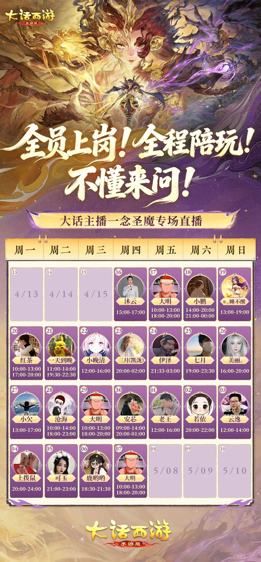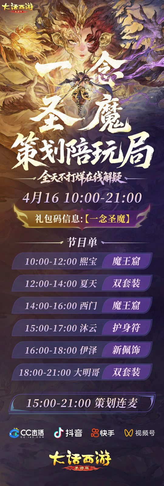 三界少侠久等了! 大话新资料片《一念圣魔》将于明日(4月16日)正式上线! 双套装、新佩饰、护身符三大系统重磅更新,新魔王窟副本驱神大殿同步开启,颠覆性战斗体验即将来袭!有奖互动 新资料片上线,玩法太多看不懂?不必四处摸索,不必反复猜测。 官方已经为少侠们备好“保姆级”攻略,助你极速上手,把版本福利吃透! 策划陪玩局,全天不打烊! 明日10:00-21:00,官方直播间将开启不间断接力直播,多位大话主播轮番上阵,深度试玩全新版本,带你第一时间解锁驱神大殿副本、双套装养成攻略! 更重磅的是,15:00-21:00策划团队将亲临直播间,在线连麦,实时答疑! 无论是新佩饰属性搭配、护身符洗炼技巧,还是双套装系统养成疑问。现场统统为你解答,版本攻略一手掌握! 直播平台覆盖视频号、抖音、CC直播、快手,礼包码【一念圣魔】同步放送,现登录游戏即可领取! 温馨提示:本次直播不在抖音官方账号播出,将由游戏主播在各自抖音直播间分场呈现。如需全程不间断观看完整内容,请优先关注大话西游手游官方视频号。 新资料片专场直播,全天候陪玩不停歇! 大话主播团队将开启为期15天的《一念圣魔》专场直播。 明日起至5月7日,大明、伊泽、西门、熙宝、夏天、沐云等数十位人气主播全员上岗!每天不同时段轮番直播新资料片内容,魔王窟通关技巧、新佩饰搭配思路、双套装洗炼秘籍,一站式解锁。少侠们可锁定心仪主播直播间,实时互动陪玩! 大话新资料片《一念圣魔》震撼上线,策划陪玩+主播专场双重狂欢,全天候陪你玩转新版本!速来锁定直播,开启你的三界新征程! |