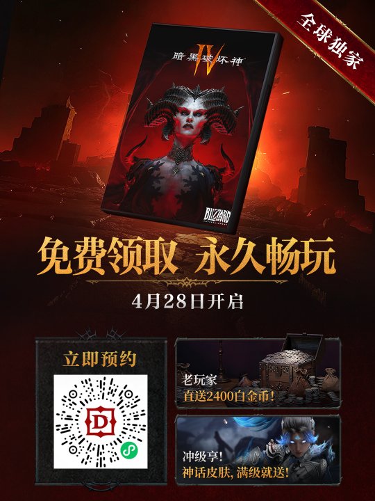 致所有勇敢的流浪者: 憎恨之王再度苏醒,庇护之地的命运正悬于一线。4月28日,《暗黑破坏神IV》全新扩展包“憎恨之王”正式登陆国服。无论你是久经战火的老兵,还是初入世界的新冒险者,现在,正是整装待发、投入战斗的时刻。 为确保每一位流浪者都能为即将到来的史诗之战做好准备,网易携手暴雪为您带来《暗黑破坏神IV》史无前例的国服专属福利! 我们向所有流浪者发出集结令,回应战斗的召唤,直面憎恨: 福利一:游戏本体限时免费领,永久入库! 为了让更多玩家亲身体验这段黑暗奇幻旅程,我们即将开放限时免费领取活动。 全新玩家可在4月28日0点至5月27日23:59期间前往官方页面,免费领取《暗黑破坏神IV》基础游戏(原价128元,现价0元),领取后永久入库!丰富的史诗级主线战役与庞大且充满细节的开放世界内容等你探索。 福利二:老玩家专属 2400 白金币回馈! 对于已经拥有游戏的老玩家,为感谢各位在《暗黑破坏神IV》早期阶段给予的支持与热情,我们为您准备了丰厚的专属好礼。 凡在4月28日之前已拥有任意版本国服《暗黑破坏神IV》的玩家,均可在4月28日0点至5月27日23:59期间免费领取2400白金币!使用这份属于先锋的致意,定制你的专属外观与装备,率先直面憎恨的阴影。 福利三:满级即送全新神话皮肤! 无论新老玩家,都将在扩展包“憎恨之王”上线后获得全新限定神话系列皮肤: 在第十三赛季中,任意新建赛季角色达到满级(不含巅峰等级),即可免费获得圣骑士全新神话主题皮肤“九天玄女”!将东方神话的璀璨威严,带入暗黑的庇护之地!除了九天玄女,你还期待哪些神话角色与暗黑破坏神的哪些角色进行联动呢? 集结你的同伴,磨砺你的利刃。庇护之地正在呼唤。 我们将在阴影中与你相见。 常见问题: 游戏本体与免费领取相关 Q:本次活动是否为国服专属? A:是的 Q:免费领取的"基础游戏本体"具体包含哪些内容? A:基础游戏指《暗黑破坏神IV》国服基础版,不包含“憎恨之躯”以及“憎恨之王”扩展内容。 Q:领取后"永久入库"具体指什么,5月27日之后是否仍可下载游玩? A:2026年4月28日至5月27日期间成功领取后,游戏将永久归属至您的账号。在国服运营期间、玩家未违反用户协议前提下,可随时下载游玩,不受30天活动期限制。 Q:免费领取需要满足哪些条件,是否需要绑定手机号? A:需拥有国服战网账号并完成网易通行证绑定。 Q:2026年4月28日前注册战网账号但未购买游戏,属于"新玩家"还是"老玩家"? A:以是否拥有《暗黑破坏神IV》国服游戏为准,未购买游戏视为新玩家,可领取免费本体。 Q:免费领取版本(128元基础版)与付费购买版本是否存在功能差异? A:领取版本与付费版本功能一致,完整体验基础版游戏所有内容。 Q:2026年5月27日之后新玩家是否还能免费获得游戏? A:活动期结束后需按原价128元购买,建议把握限时领取机会。 Q:同一身份证下的多个战网账号,是否可以多次领取? A:同一身份证的多个国服账号只可以领取一次,请谨慎选择实际领取的账号。 老玩家回馈相关 Q:白金币可用于购买哪些内容? A:2400白金币可用于商城外观与赛季通行证购买,具体可购内容请以游戏内商城展示为准。 Q:2400白金币是否有有效期,是否可以留存至后续赛季使用? A:白金币为账号内永久货币,无使用期限限制。 Q: 白金币在哪里领取? A:老玩家需要在2026年4月28日-5月27日期间,前往活动页面领取。白金币领取后会在2个工作日内到账。 神话主题皮肤福利与赛季相关 Q:"第十三赛季"何时开启,与扩展包上线时间是否一致? A:第十三赛季将与“憎恨之王”扩展内容同步于4月28日上线,具体开服时间请关注官方公告。 Q:"满级"具体指多少级,永恒服角色是否符合条件? A:需使用国服新建赛季角色达到当前赛季等级上限,不包含巅峰等级,永恒服角色不参与本活动。 Q:我十三赛季角色已满级,为何没有自动获得皮肤? A:满足领取条件后,请在4月28日-5月27日活动期间,前往活动页面领取奖励。奖励会在2个工作日内到账。 |