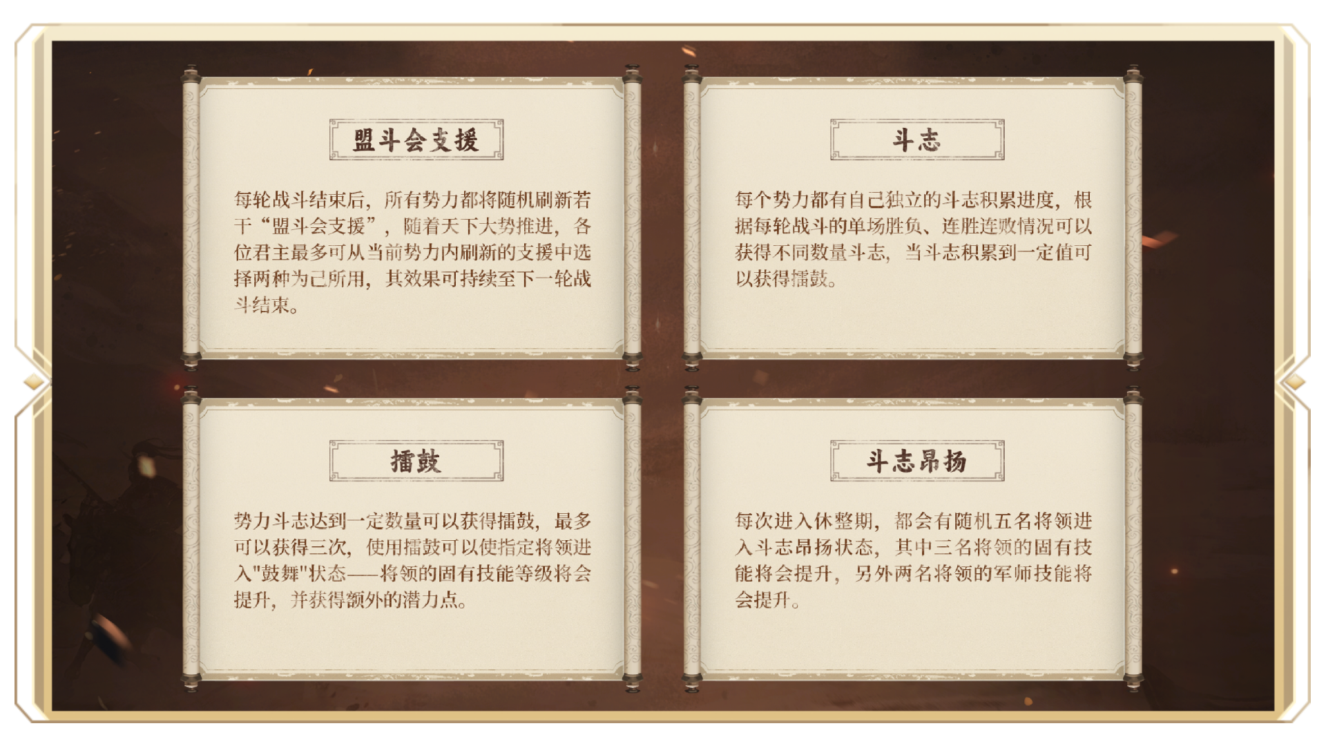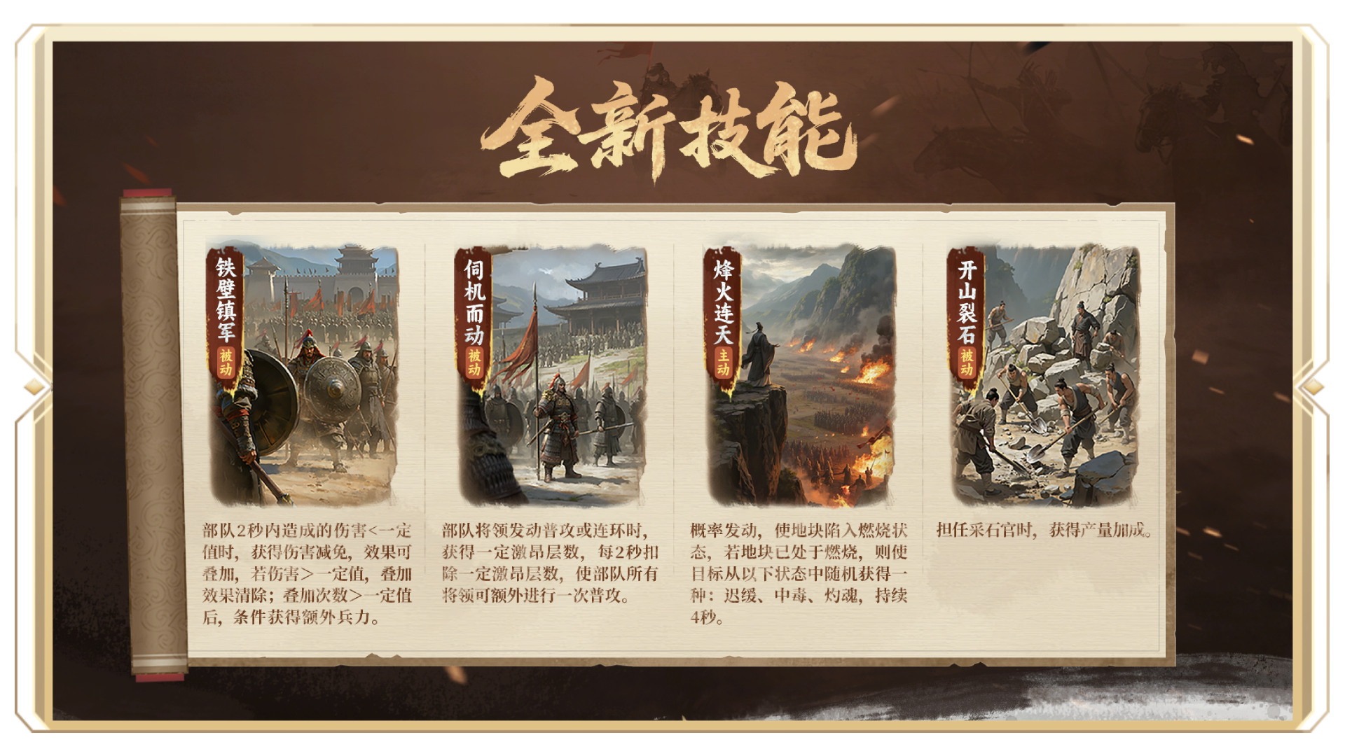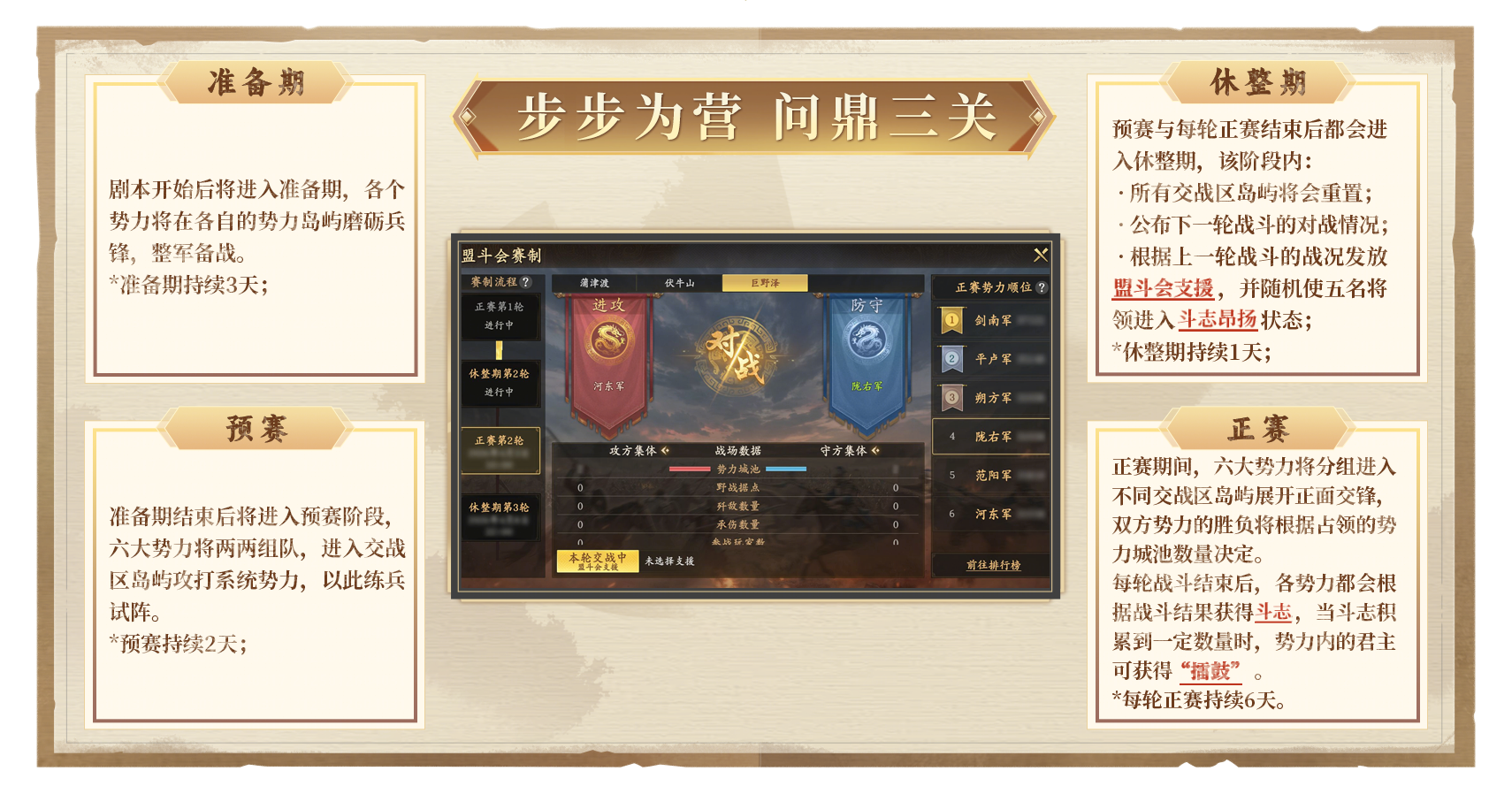 《王于兴师》「三关定鼎」剧本现已正式开启!天下第一·盟斗会战幕拉开——三座交战区岛屿各具天险,或水域纵横,或山峦起伏,或沼泽密布,六大势力于此轮番对垒。斗志与盟斗会支援系统为战场带来更多变数。更有华夏名将倾力相助,助君问鼎三关! 「六岛砺刃 三关争雄」 在「三关定鼎」中,六大势力将分据东西两侧六座势力岛屿,在此厉兵秣马、整军备战。随着"天下第一·盟斗会"赛程的推进,各方势力将分为攻守双方,分赴中央的三座交战区岛屿鏖战争锋。 三座交战区岛屿有着截然不同的战场环境——蒲津渡水域纵横,水战将成为胜负关键;伏牛山高低错落,地势之利可左右战局;巨野泽沼泽密布,行军布阵需慎之又慎。面对迥异的战场,唯有灵活调整配队、善用地形之利,方能克敌制胜。 在这片战场之上,还将引入多种建筑设施,运用得当,便可步步为营,稳操胜券。 战地大营:位于交战区岛屿的特殊城池,可将势力岛屿内的部队传送至交战区,亦可将战地大营中的部队送回势力岛屿。战地大营可进行军团委托,每个联盟可在己方势力的战地大营中创建最多三个军团; 势力城池:每座交战区岛屿上均设若干势力城池,彼此无连线关系。在指定时间内,双方可任意对势力城池宣战。占领势力城池的数量将影响当轮的胜负结算; 野战据点:位于交战区岛屿内拥有势力范围的区域,可通过占点争夺的方式占领。当据点范围内仅存在一方势力时,该势力的占领进度条将会持续增长,占领进度条满100%后即可占领该据点。占领野战据点的数量将影响当轮的胜负结算; 分城:正赛阶段可在交战区岛屿己方势力范围内建造。建成后,君主可将部队调动至分城,在此调整部队配置,并可直接调用主城预备兵,实现快速补给; 亭障:位于交战区岛屿的中立资源点。击败亭障内守军即可占领,为己方提供视野。每位君主最多可同时占领五座亭障; 山隘:位于交战区岛屿上的特殊建筑设施,部队无法通过非己方势力所属的山隘。 「以战养战 决胜三关」 “天下第一·盟斗会”赛程分为准备期、预赛、休整期与正赛四个阶段,环环相扣,每一场战斗都关乎天下第一盟的归属。 准备期:剧本开启前三天,六大势力将在各自势力岛屿上开荒发育、磨砺兵锋。准备期即将结束时,揭晓预赛的分组情况; 预赛阶段:准备期结束后进行为期两天的预赛。六大势力两两组队成为攻方,分赴三座交战区岛屿,攻打由系统势力组成的守方,预赛结果将影响下轮的对手匹配情况; 休整期:预赛及每轮正赛结束后,将进入为期一天的休整期。休整期内可以选择支援效果、使用擂鼓,并公布下一轮战斗的对阵情况; 正赛阶段:休整期后将进入持续六天的正赛。六大势力将按匹配结果进入不同交战区岛屿展开正面交锋。 占领野战据点、势力城池均可以获得占领分,其中,占领野战据点可获得2分、占领初始城池可获得5分,占领中心城池可获得11分。 每轮战斗将根据以下规则判定胜负: · 本轮占领分分差 < 20,则分高者为险胜,分低者为惜败; · 本轮占领分分差 ≥ 20,则分高者为大胜,分低者为大败; · 若双方占领分相同,则根据总歼敌数判定胜负,总歼敌高者为险胜,低者为惜败; · 若以上数据均相同,则对比上一轮战斗中双方的最高势力排名,排名低的一方为险胜,排名高的一方为惜败。 进入休整期后,所有势力将根据上一轮胜负情况随机刷新盟斗会支援效果,该效果于下一轮比赛中生效。势力战绩越好,刷新高品质支援效果的概率就越高。 此外,进入休整期后,各势力还会根据战斗结果及连胜情况获得斗志值。当本势力斗志积累到一定数量时,势力内的君主可获得"擂鼓"。擂鼓可于休整期间对指定将领使用,使用后该将领将进入"鼓舞"状态——其固有技能等级将额外+1级,并可额外获得30点临时潜力点。 除了斗志以外,每次进入休整期还会有五名随机将领获得"昂扬"效果,其中三名将领的固有技能等级额外+5级,其余两名将领的军师技能额外+3级。当将领同时存在"昂扬"和"鼓舞"状态时,仅"昂扬"状态生效。 「全新将领 全新技能」 在「三关定鼎」剧本中,四大全新将领——郭子仪、陈庆之、吕蒙、赵飞燕将倾力相佐,助君问鼎三关! 更有「铁壁镇军」、「伺机而动」、「烽火连天」、「开山裂石」四大全新技能助力各位君主夺得天下第一盟之殊荣。 "天下第一·盟斗会"擂台已备,且看各路豪强如何杀出重围,让联盟之名威震天下!《王于兴师》全新赛季「三关定鼎」,静候君临! 关于《王于兴师》 《王于兴师》是一款以“立体地形战场”和“个性化将领搭配”为核心体验的即时沙盘战略手游。游戏采用了真实立体地形,每个部队都拥有不同的射程,精准指挥每支部队,搭配真实的体积碰撞系统,每一次交锋都是策略与微操的双重考验。在《王于兴师》这个宏伟的古代战场上,你的军事天赋将会尽情释放! |