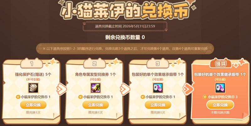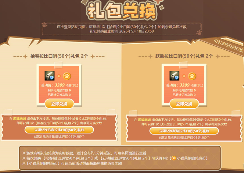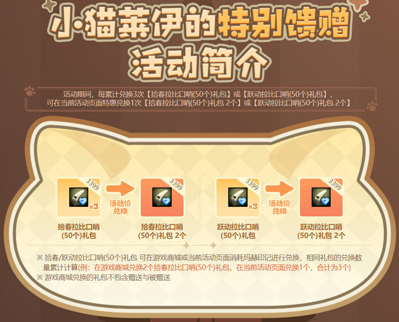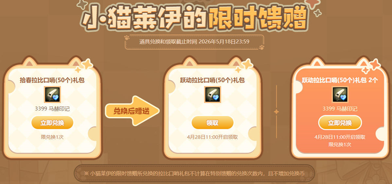 近日,为迎新版本上线,《洛奇英雄传》开启一系列福利活动!不仅英雄们可参与至小猫莱伊的特别馈赠活动,以超值马赫印记兑换拉比口哨礼包,还有装备共享和转移折扣活动,以及实用道具满满的春季自助机活动哦!现在,让我们一起一探究竟吧! 【小猫莱伊的拉比口哨特别馈赠】 在官网活动页面中,英雄们每累计兑换3次“拾春拉比口哨(50个)礼包”或“跃动拉比口哨(50个)礼包”,可在页面中特惠兑换1次“拾春拉比口哨(50个)礼包2个”或“跃动拉比口哨(50个)礼包2个”。 首次登录活动页面还可获得1次“拾春拉比口哨(50个)礼包2个”的可兑换次数! 兑换“拾春拉比口哨(50个)礼包2个”或“跃动拉比口哨(50个)礼包2个”还将获得1枚小猫莱伊的兑换币,兑换币可以兑换到各种高价值实用道具! 最后,还有小猫莱伊的限时馈赠活动,大家可不要错过啦! 【装备共享&转移折扣活动】 在4月28日维护前,装备共享&转移费用限时7折,冷却时间重置。 【春季自助机活动】 在5月19日维护前,春季自助机活动开启,活动期间每周可从账号邮箱获得20个春季自助机硬币,消耗硬币可兑换限定任务和常规任务,完成任务将获得礼券,礼券可在兑换商店兑换到防具强化保护石、塔里安钢铁等实用道具。 以上,就是《洛奇英雄传》火热进行中的福利活动,积极参与,为自己赢取奖励!还可以特惠价格兑换到拉比口哨礼包哦!走过路过不要错过啦! |