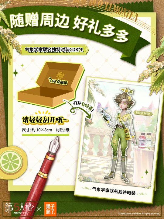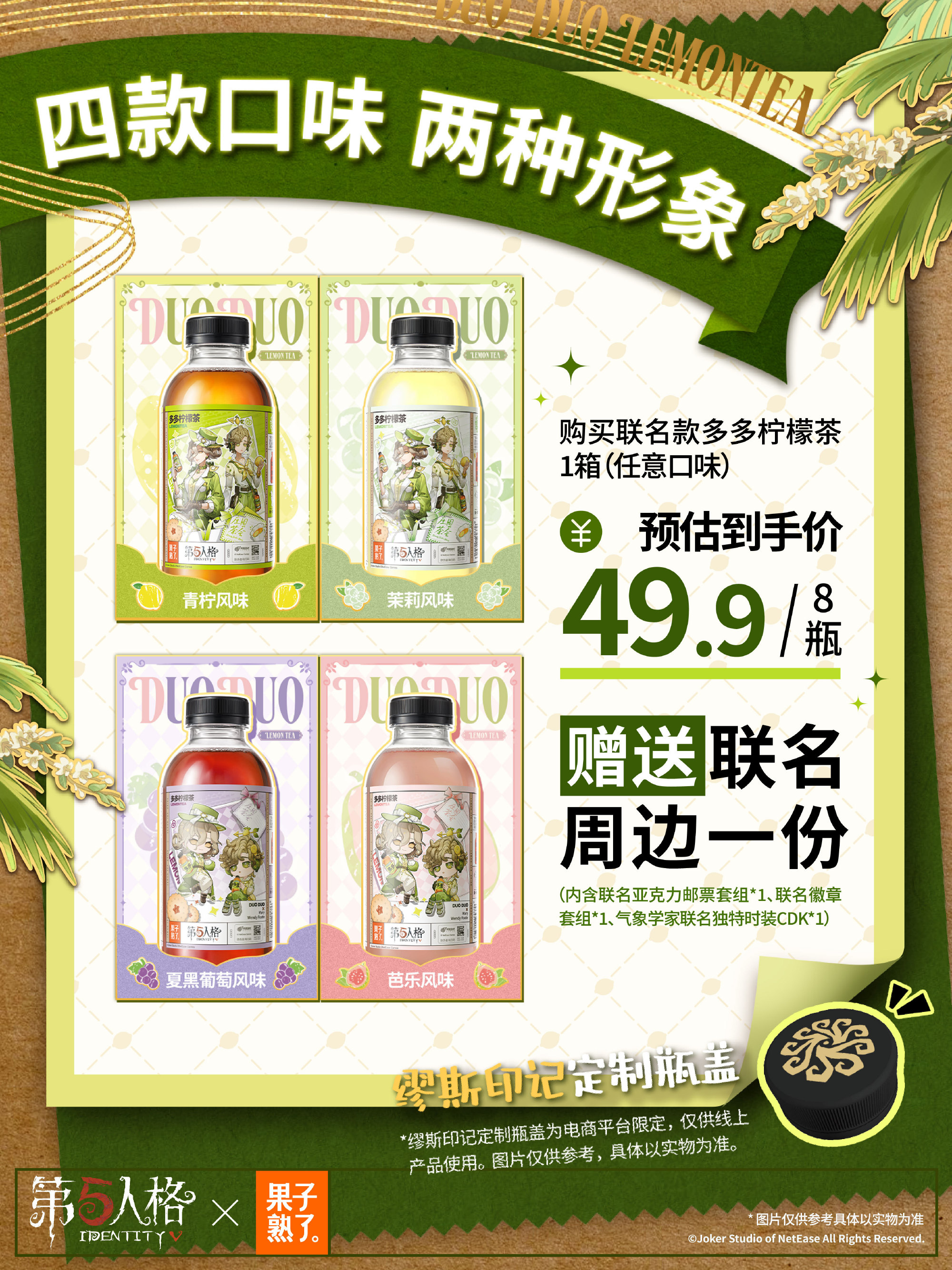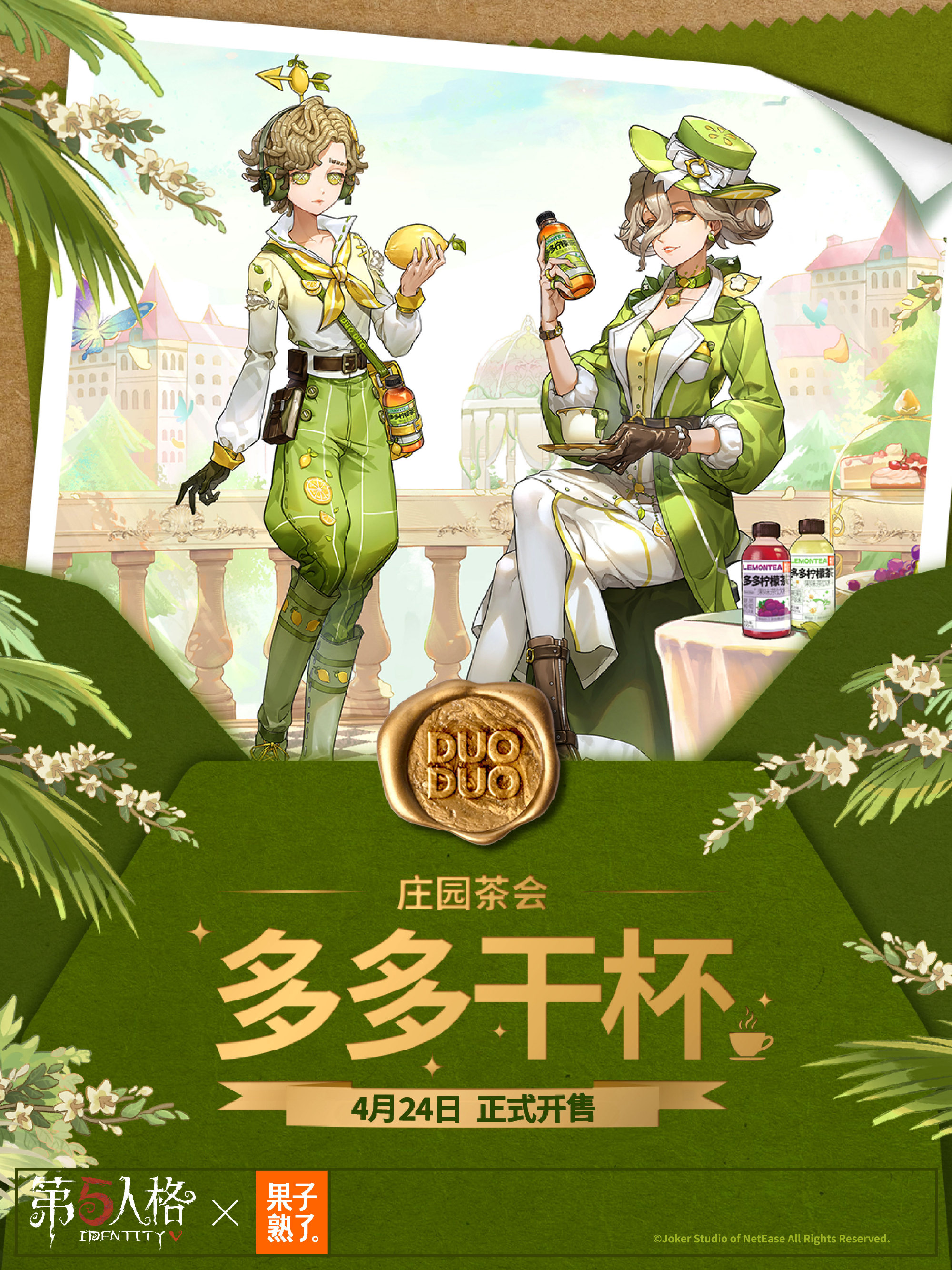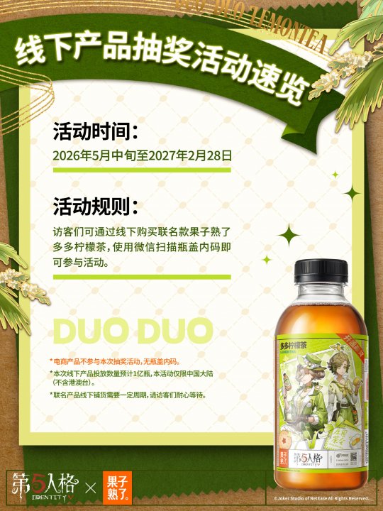 庄园茶会,多多干杯!4月24日中午12点,《第五人格》与果子熟了多多柠檬茶第三弹联名正式上线,这场筹备已久的"庄园茶会"将带着全新升级的惊喜,邀访客们共赴一场干杯之约。 当缪斯印记的瓶盖悄然旋动,通往庄园的奇幻秘境由此洞开。本次庄园茶会受邀好友是气象学家温迪与红夫人玛丽,与大家共饮。 而联名款多多柠檬茶瓶身设计也是暗藏巧思,气象学家与红夫人两位庄园好友的绝美形象跃然其上。特调四重风味,青柠的爽、茉莉的雅、黑葡萄的浓、芭乐的甜,每一次举杯都有意想不到的味道。 线上购物狂欢率先在京东平台引爆。4月24日中午12点起,京东果子熟了自营旗舰店将开启首发专场,购买联名款即可获赠气象学家【独特时装】-柠檬多多及联名周边。 次日12点,天猫、抖音、拼多多等六大电商平台同步开售,购买整箱任意口味联名茶饮,即可解锁包含联名亚克力邮票套组*1、联名徽章套组*1及气象学家联名独特时装CDK*1在内的三重惊喜礼包。 联名亚克力邮票套组 背卡尺寸:约18x10.6cm,亚克力尺寸:约6x6cm;材质:亚克力、纸,工艺:彩窗工艺+柯式印刷 联名徽章套组 背卡尺寸:约15x10cm,徽章尺寸:约5.8x5.8cm;材质:马口铁、纸,工艺:触感银+UV浮雕 气象学家联名独特时装CDK 尺寸:约10x8cm,材质:纸 线下狂欢同样精彩纷呈。2026年5月中旬至2027年2月28日,全国范围内(中国大陆)将投放1亿瓶联名款多多柠檬茶。 大家只需扫描瓶盖内码,即可参与抽奖活动——100万份联名专属头像、100万份头像框、100万套联名【独特时装】气象学家-柠檬多多、5000只温变魔法杯、24款定制微信表情包。奖品总量爆表,只等欧皇的你。 4月24日中午12点开售预估到手价49.9元/8瓶,访客们前往各大电商平台官方店铺即刻进行购买。此刻,庄园的大门已经敞开,春日的茶香正在飘散。让我们共同举杯,开启这场春日狂欢,这一次,你真的不来赴约吗? 感谢官方独家茶饮合作伙伴果子熟了多多柠檬茶的大力支持! |
