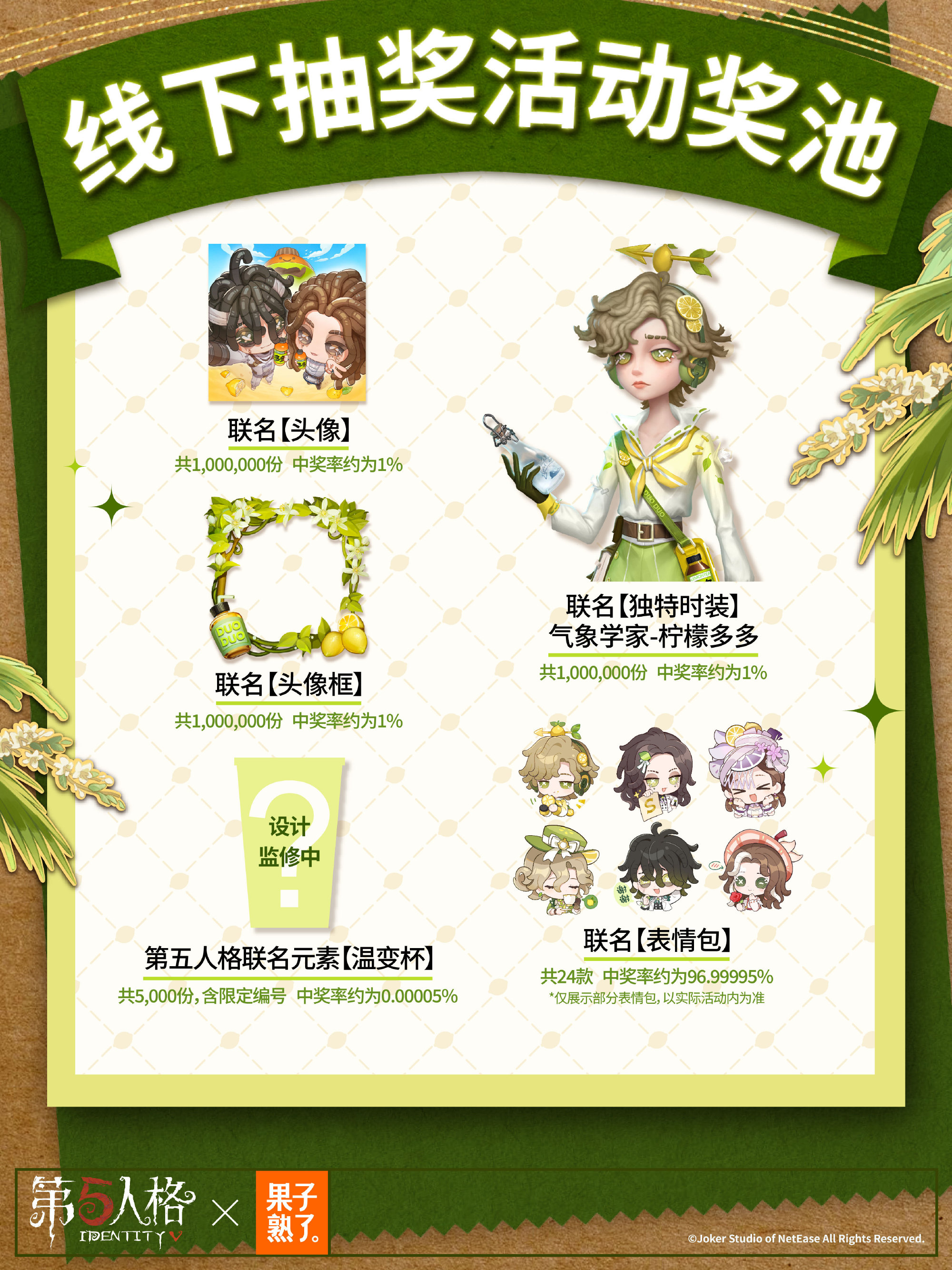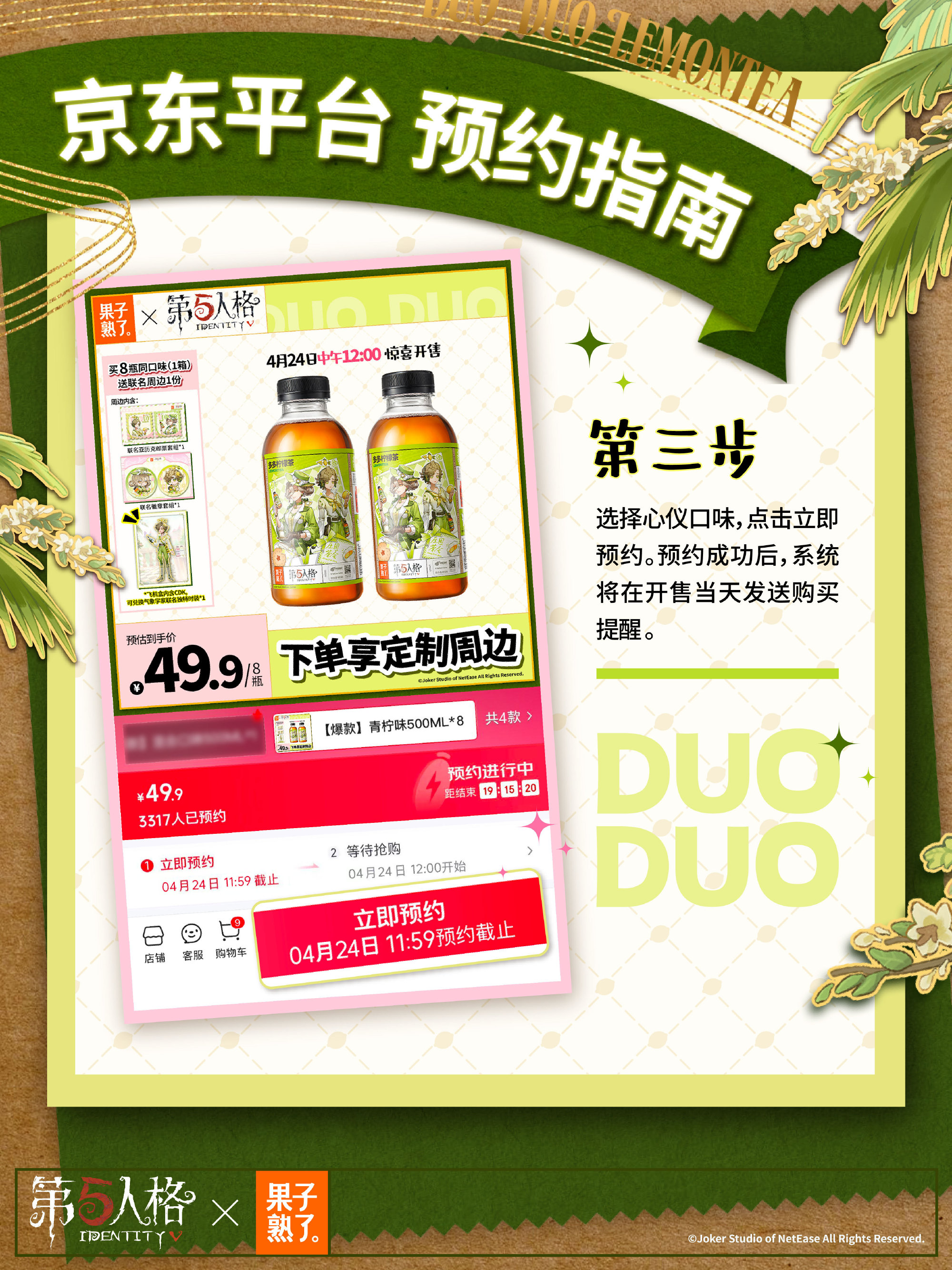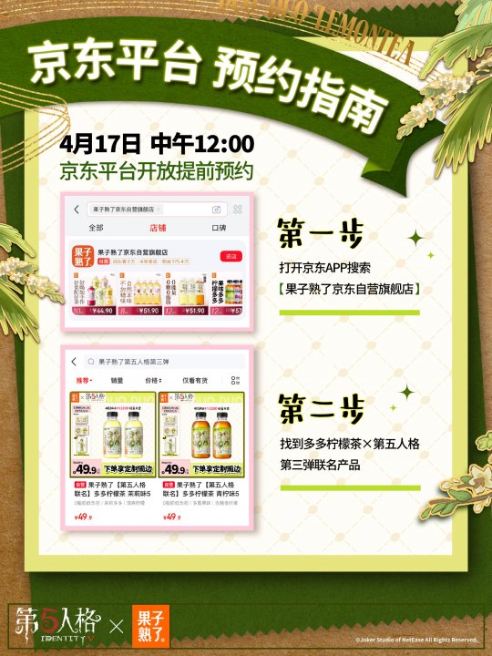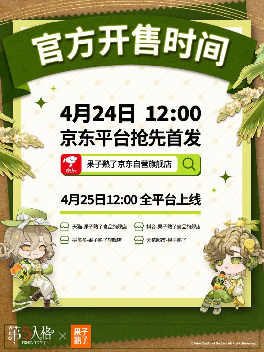 庄园茶会,多多干杯!4月24日中午12点,《第五人格》与果子熟了多多柠檬茶第三弹联名正式上线,这场筹备已久的"庄园茶会"将带着全新升级的惊喜,邀访客们共赴一场干杯之约。 当缪斯印记的瓶盖悄然旋动,通往庄园的奇幻秘境由此洞开。本次庄园茶会受邀好友是气象学家温迪与红夫人玛丽,与大家共饮。 而联名款多多柠檬茶瓶身设计也是暗藏巧思,气象学家与红夫人两位庄园好友的绝美形象跃然其上。特调四重风味,青柠的爽、茉莉的雅、黑葡萄的浓、芭乐的甜,每一次举杯都有意想不到的味道。 线上购物狂欢率先在京东平台引爆。4月24日中午12点起,京东果子熟了自营旗舰店将开启首发专场,购买联名款即可获赠气象学家【独特时装】-柠檬多多及联名周边。 次日12点,天猫、抖音、拼多多等六大电商平台同步开售,购买整箱任意口味联名茶饮,即可解锁包含联名亚克力邮票套组*1、联名徽章套组*1及气象学家联名独特时装CDK*1在内的三重惊喜礼包。 联名亚克力邮票套组 背卡尺寸:约18x10.6cm,亚克力尺寸:约6x6cm;材质:亚克力、纸,工艺:彩窗工艺+柯式印刷 联名徽章套组 背卡尺寸:约15x10cm,徽章尺寸:约5.8x5.8cm;材质:马口铁、纸,工艺:触感银+UV浮雕 气象学家联名独特时装CDK 尺寸:约10x8cm,材质:纸 线下狂欢同样精彩纷呈。2026年5月中旬至2027年2月28日,全国范围内(中国大陆)将投放1亿瓶联名款多多柠檬茶。 大家只需扫描瓶盖内码,即可参与抽奖活动——100万份联名专属头像、100万份头像框、100万套联名【独特时装】气象学家-柠檬多多、5000只温变魔法杯、24款定制微信表情包。奖品总量爆表,只等欧皇的你。 4月24日中午12点开售预估到手价49.9元/8瓶,访客们前往各大电商平台官方店铺即刻进行购买。此刻,庄园的大门已经敞开,春日的茶香正在飘散。让我们共同举杯,开启这场春日狂欢,这一次,你真的不来赴约吗? 感谢官方独家茶饮合作伙伴果子熟了多多柠檬茶的大力支持! |