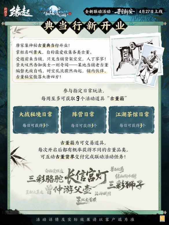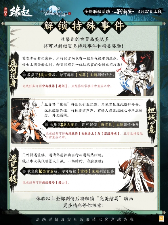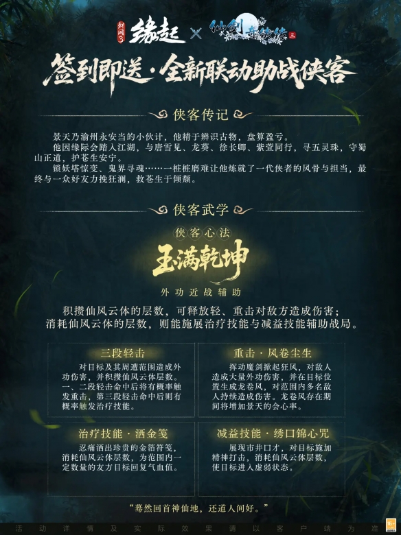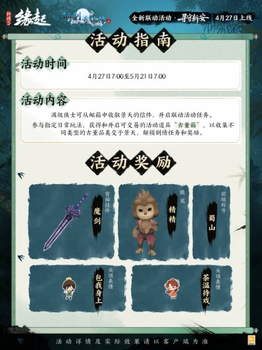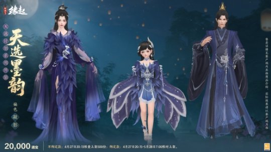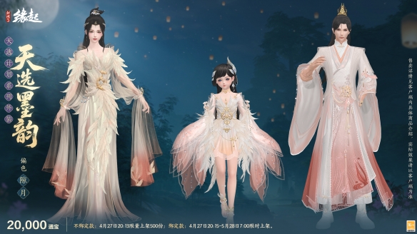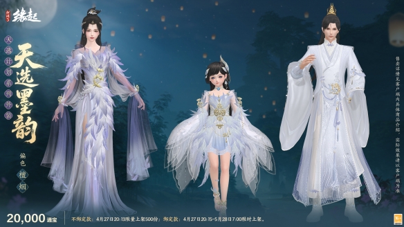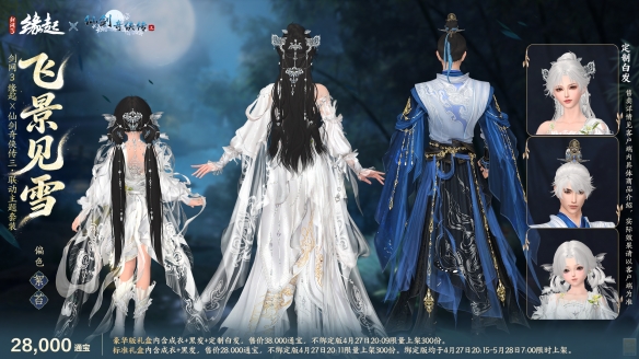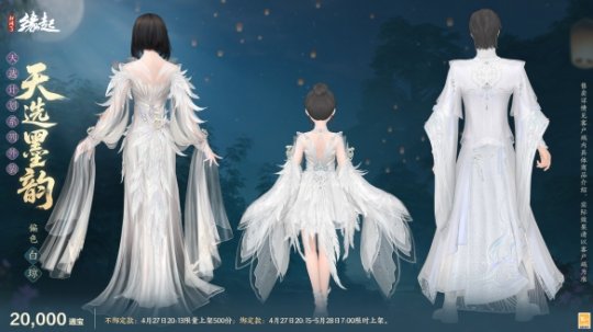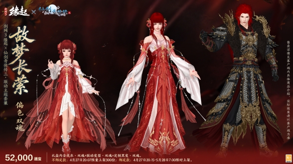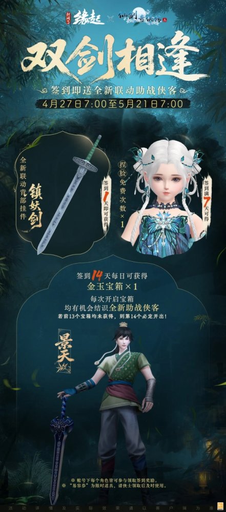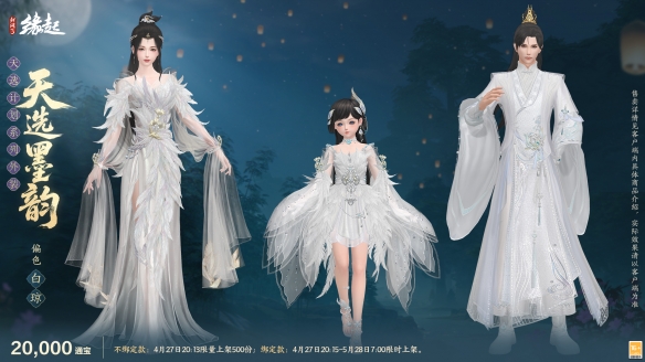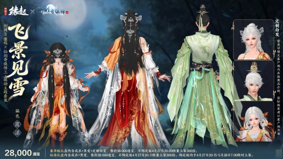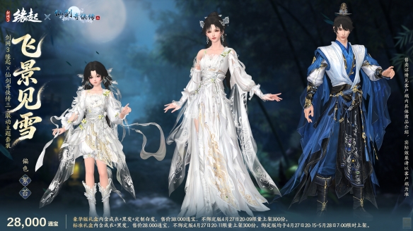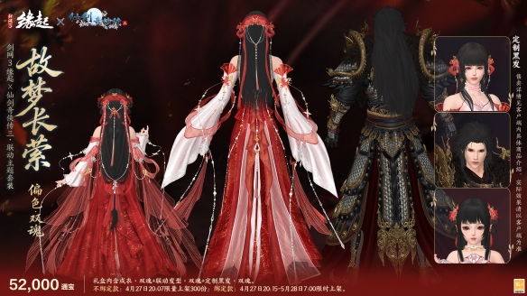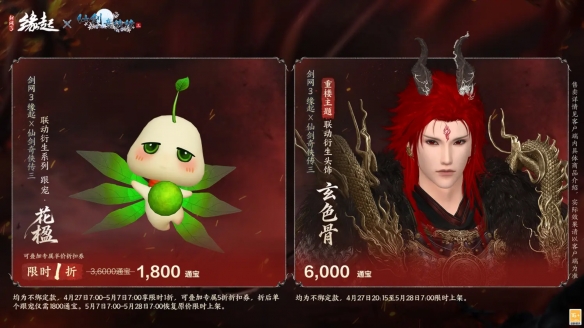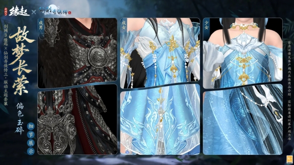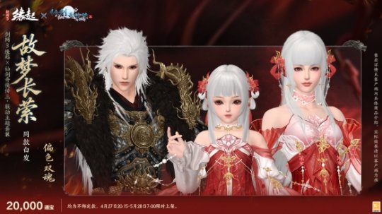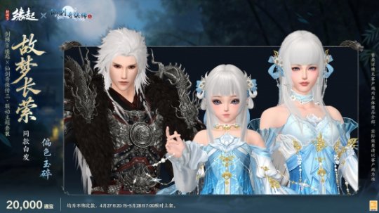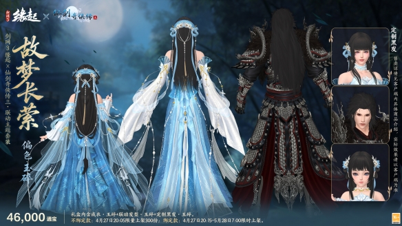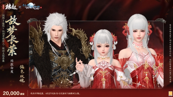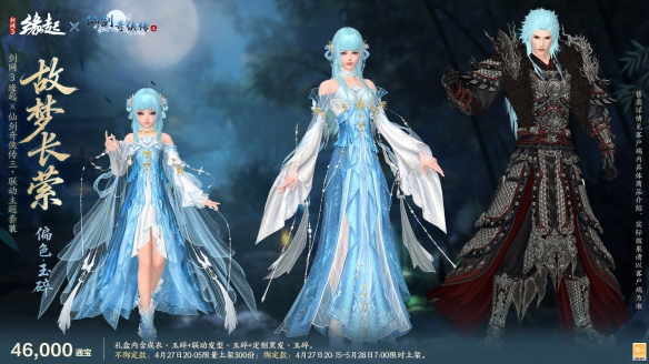何为“侠”?问迹问心,不问出身与过往。《剑网3缘起》×《仙剑奇侠传三》联动版本今日启幕,跨越时空的情怀之作纷至沓来,经典天选系列外装亦复刻归来。姜国公主的双魂风华,魔尊临世的盖世威仪,少年仗剑的人间烟火,灵宠相伴的江湖暖意——多款联动外观、典藏复刻、萌趣跟宠同步上线。以盛唐华裳重述仙剑经典,借江湖侠气再赴千年之约,诚邀诸位侠士共赴这场情怀盛宴。 【双剑相逢赴江湖 联动签到福利启】 仙剑一梦越千载,侠义同辉入大唐。签到活动上线,海量联动福利免费解锁,仙剑经典角色景天化身助战侠客现身江湖,邀你并肩仗剑。 渝州市井藏侠骨,一剑飞景定乾坤。景天本为渝州永安当的小伙计,聪慧机敏,善辨古物,过目不忘,性情随和开朗,重诺重情。因缘际会下偶得魔剑踏入江湖,与知己同行,寻五灵珠,破锁妖塔,护蜀山正道。一路风雨磨砺,他从市井少年成长为心怀天下的一代侠者。 渝州故梦入大唐,新安典当聚侠踪!联动主题活动「寻守新安」开启。永安当掌柜景天现身唐家集新开古董典当行,诚邀侠士共寻奇珍,解锁仙剑经典角色专属剧情,海量限定好礼免费得。 一入典当识故友,一剑江湖续前缘。蓦然回首神仙地,还道人间好。海量联动好礼,沉浸式仙剑剧情,诚邀侠士共赴「寻守新安」之约,在大唐江湖续写属于你的仙剑传奇。 龙葵与重楼衍生主题套装「故梦长萦」 大梦初醒,难遣流年,全新联动套装「故梦长萦」,以《仙剑奇侠传三》魔界至尊重楼、姜国公主龙葵为灵感衍生创作,将角色经典风骨与盛唐华裳深度相融,特设两款专属偏色复刻角色神韵,让仙剑旧梦于大唐江湖再绽风华。 成男款以重楼为原型,锁子甲为底,肩覆玄黑兽毛与龙魂图腾,衣身雕铸魔纹暗刻,护心镜与金属护具加持,破边下摆暗藏锋芒。 成女款以龙葵为原型,冰绡鲛纱裁就流云广袖,袖间垂落莹白珠络,裙摆仙气盈盈,清雅矜贵。 萝莉款以龙葵为灵感,采用改良露 肩短款襦裙,一字肩设计灵动娇俏,薄纱广袖轻盈垂坠,步间轻纱摇曳。 售卖信息: 偏色「玉碎」: 礼盒包含定制成衣、定制黑发、定制蓝发。 售价46,000通宝。 不绑定款4月27日 20:05限量上架300份; 绑定款4月27日20:15-5月28日7:00限时上架。 偏色「双魂」: 礼盒包含定制成衣、定制黑发、定制红发。 售价52,000通宝。 不绑定款4月27日20:07限量上架300份; 绑定款4月27日20:15-5月28日7:00限时上架。 「故梦长萦」同款定制白发 「故梦长萦」同款定制白发同步上架,发丝莹润顺滑,贴合各体型打造专属发式,搭配同系列精致饰件,与外装风骨完美契合。成男款凌厉孤高,成女款清逸温婉,萝莉款娇俏灵动,两款偏色对应角色神韵,可单独选购。 售卖信息: 售价20,000通宝. 4月27日20:15-5月28日7:00 限时上架,均为不绑定款。 景天与雪见衍生主题套装「飞景见雪」 人间情痴,缘聚有时。本次联动套装「飞景见雪」,以《仙剑奇侠传三》中重情重义的少年侠士景天、灵动明媚的唐家大小姐唐雪见为设计灵感衍生创作,将角色性格特质与盛唐服饰的飘逸形制相融,特设两款专属偏色复刻角色经典神韵,让仙剑里的人间烟火与江湖意气,于大唐江湖完美重现。 成男款以景天为原型衍生设计,衣身缀流云暗纹与金线绣饰,设计利落大气,宽幅腰封束出挺拔身形,衣摆垂坠飘逸,步间自带少年侠气。 成女款以唐雪见为原型衍生设计,袖摆如流云舒展,饰以鎏金缠枝暗纹,鬓间银饰与衣间花叶缀饰相映,暗合其神树灵实的本源。 萝莉款以唐雪见为灵感衍生设计,贴合少女娇俏身形,薄纱广袖轻盈灵动,层叠裙摆错落有致,衣身缀以花叶饰件与珠络,玲珑精致。 售卖信息: 豪华款售价38,000通宝。 礼盒包含定制成衣、定制黑发、定制白发。 不绑定款4月27日20:09限量上架300份; 绑定款4月27日20:15-5月28日7:00限时上架。 普通款售价28,000通宝。 礼盒包含定制成衣、定制黑发。 不绑定款4月27日20:11限量上架300份; 绑定款4月27日20:15-5月28日7:00限时上架。 重楼主题联动衍生头饰「玄色骨」 玄铁凝魔骨,龙角镇六界。重楼主题联动衍生头饰「玄色骨」同步重磅上架!佩戴间尽显桀骜气场。 玄铁铸嶙峋角身,造型凌厉不羁,历经烽火淬炼,不怒自威,完美展现盖世威仪。佩戴间尽显杀伐果决的桀骜气场,为侠士江湖行止再添慑人锋芒。 售卖信息: 售价6,000通宝, 4月27日20:15至5月28日7:00限时上架,均为不绑定款。 联动衍生跟宠花楹 《剑网3缘起》×《仙剑奇侠传三》联动衍生跟宠「花楹」软萌登场!跟宠以仙剑三经典五毒兽花楹为原型,圆嫩身形憨态可掬,青枝展翼灵动懵懂,水润眼眸藏满软萌稚气,将伴侠士踏遍大唐山河,为江湖行止添上满满暖意。 售卖信息: 原价36,000通宝, 4月27日7:00至5月7日7:00限时1折特惠,折后3,600通宝, 可叠加上线即赠的5折专属折扣券,券后低至18元; 5月7日7:00至5月28日7:00回归原价,均为不绑定款。 天选计划系列外装「天选墨韵」 羽纱裁云影,金纹织风华。天选系列外装「天选墨韵」以灵鹤羽翼为设计灵感,将层叠飘逸的轻纱与精致华美的金饰绣纹相融,整体形制灵动雅致。 衣身羽纱纹理细腻自然,步间衣袂翩跹,似鹤舞清霄,如流风拂雪。四款专属偏色各有特色,或明丽暖融,或清逸如烟,或素净雅致,或深邃沉稳,适配不同侠士的穿搭喜好与江湖气质。 成男款剪裁挺拔利落,宽幅腰封束出俊朗身形,衣身暗纹精致工细,下摆层叠有致,温润端方,尽显清贵风