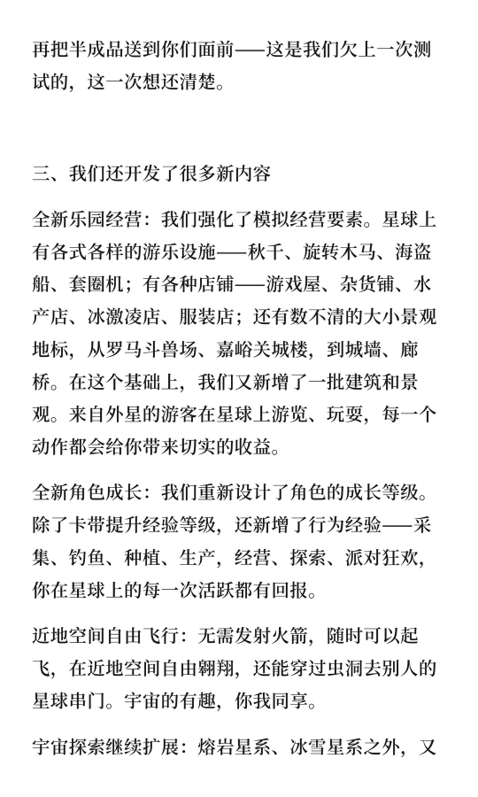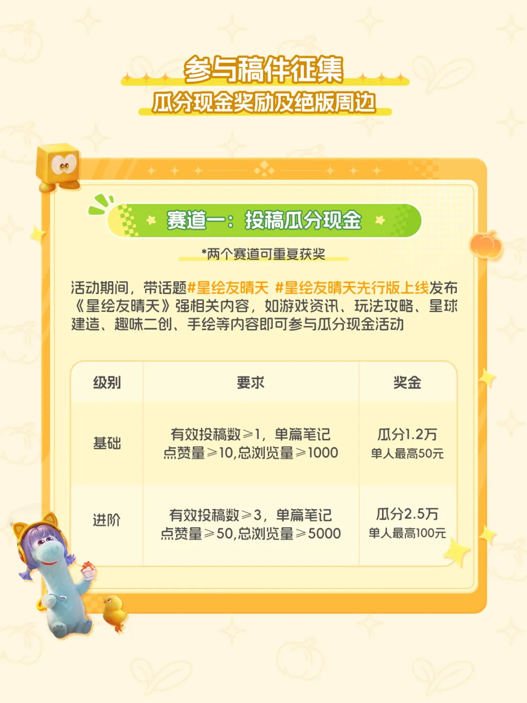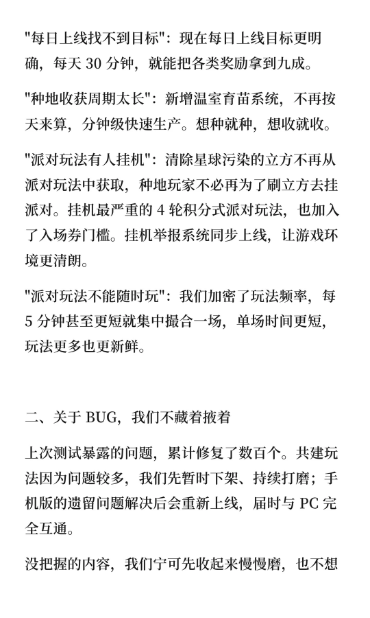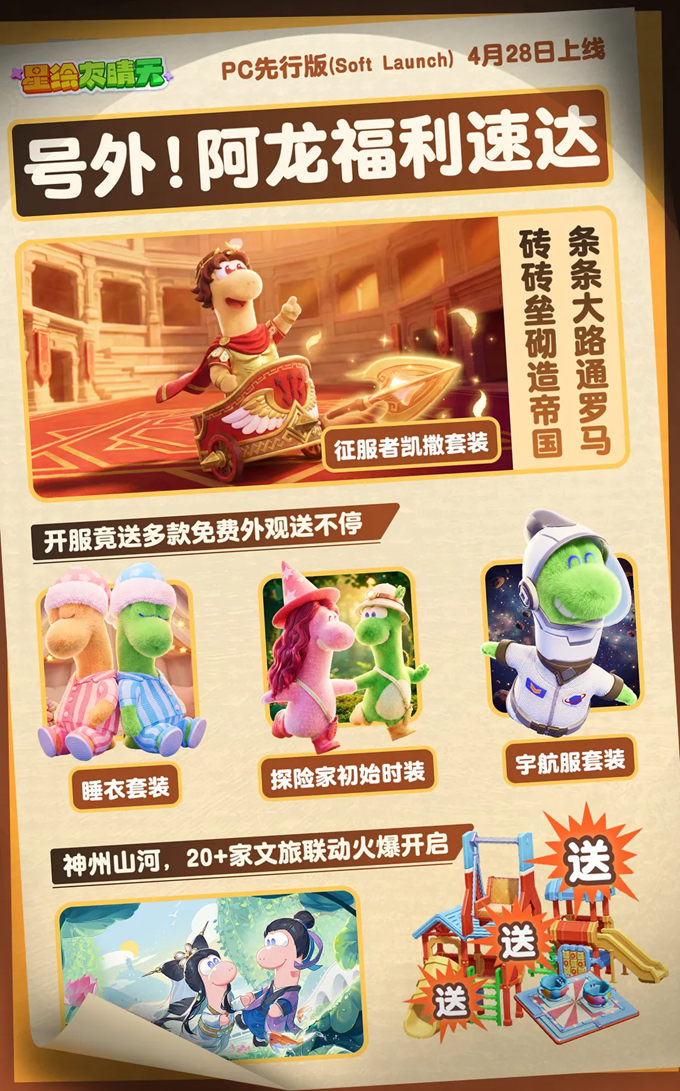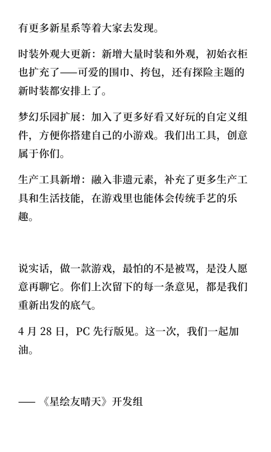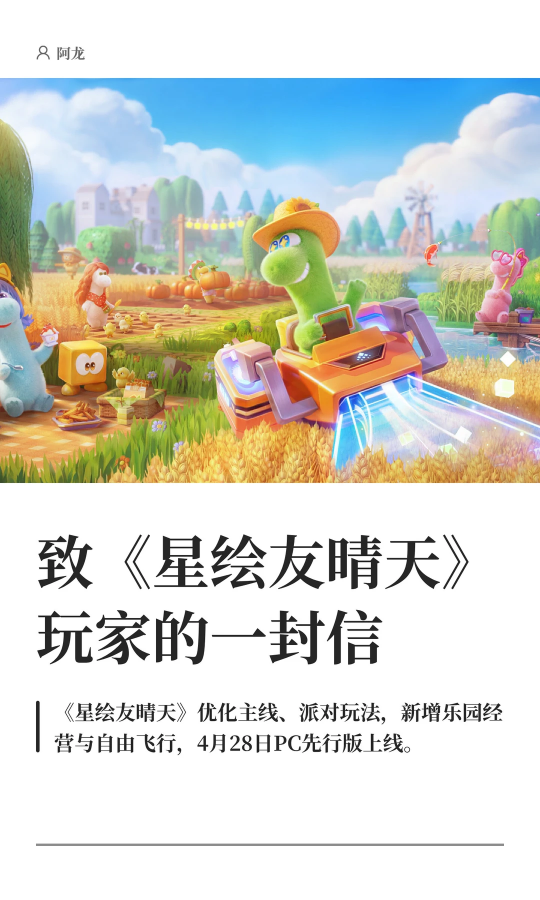 如果你有时觉得,生活需要一点乐趣—— 不如换一颗星球,重新开始! 网易全新宇宙生活模拟游戏《星绘友晴天》 PC先行版(Soft launch)今日开服! S0赛季「神州行」开启 在新星球,开启你的新生活! —— 白天种种地,晚上开趴体 —— 在这颗立方星上,只有最纯粹的快乐! 白天,开垦一块星际土地,种下奇奇怪怪、可可爱爱的作物,亲手把一片荒地变成温馨的家园; 夜幕降临,宇宙的快乐却不停歇,叫上你的朋友,去玩具星球开一场派对吧! 怎么样,亲爱的星星探险家,请带着这份《立方星游玩指引》,前往银河,领取你的专属星星吧! 为了欢迎各位“主理龙”,立方星上也举办着热闹的活动,还有诸多外观上新,千万不要错过~ 以下展示外观、飞船皮肤等,均可通过活动/幸运金币奖池免费获得。 —— 神州好河山,宇宙共观赏 —— S0赛季「神州行」,《星绘友晴天》联手全国20+文旅伙伴,将把神州大地的风貌搬进立方宇宙! 第一站:杭州 —— 开服不孤单,大家齐相伴 —— 开发龙们有好多好多话,想要和星星探险家们说,正因你们的存在,宇宙才焕发生机! 感谢500万来自地球各地的小龙们,我们将一起点亮立方宇宙的灯火。 开发龙们将在小红书/B站开启3天(4月28日-4月30日)的陪伴式直播;小红书平台也将开启激励计划与抽奖活动。一起分享在立方星的趣闻吧! 4月28日,与大家不见不散! 《星绘友晴天》融合了生活模拟与休闲派对玩法,将支持PC、移动多端互通。你将成为一颗立方星球的主理龙,白天种种地、晚上开Party! 立方星球有六个面,游戏中也有“六边形”玩法循环:探索-搜集-建设-养成-社交-创造,保证让您获得新颖的、有趣的游戏体验! |