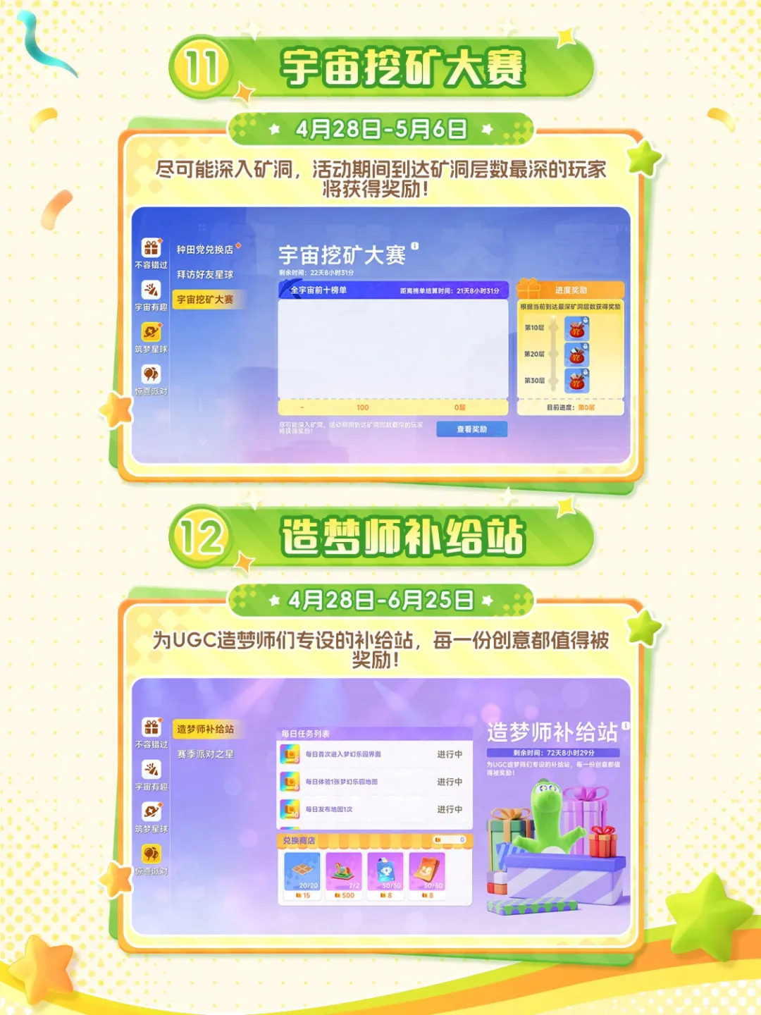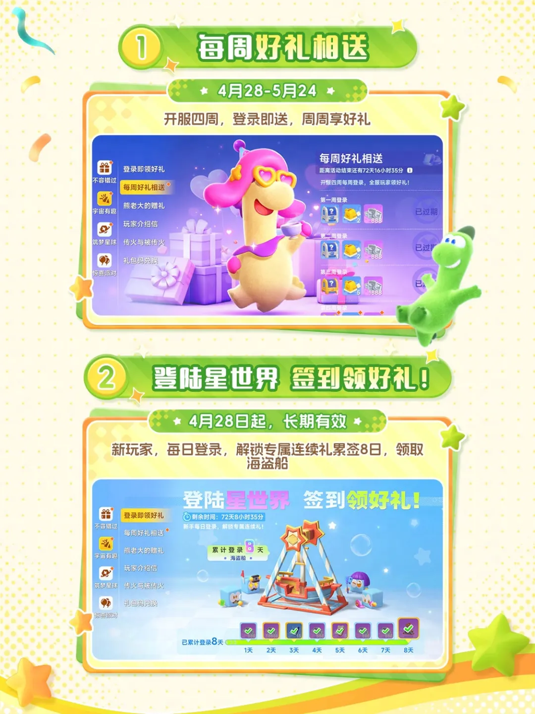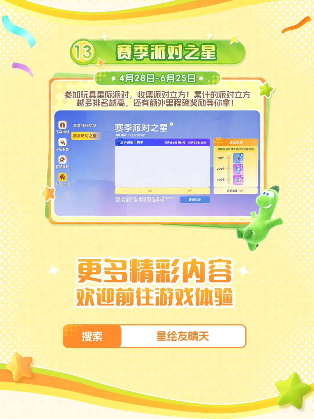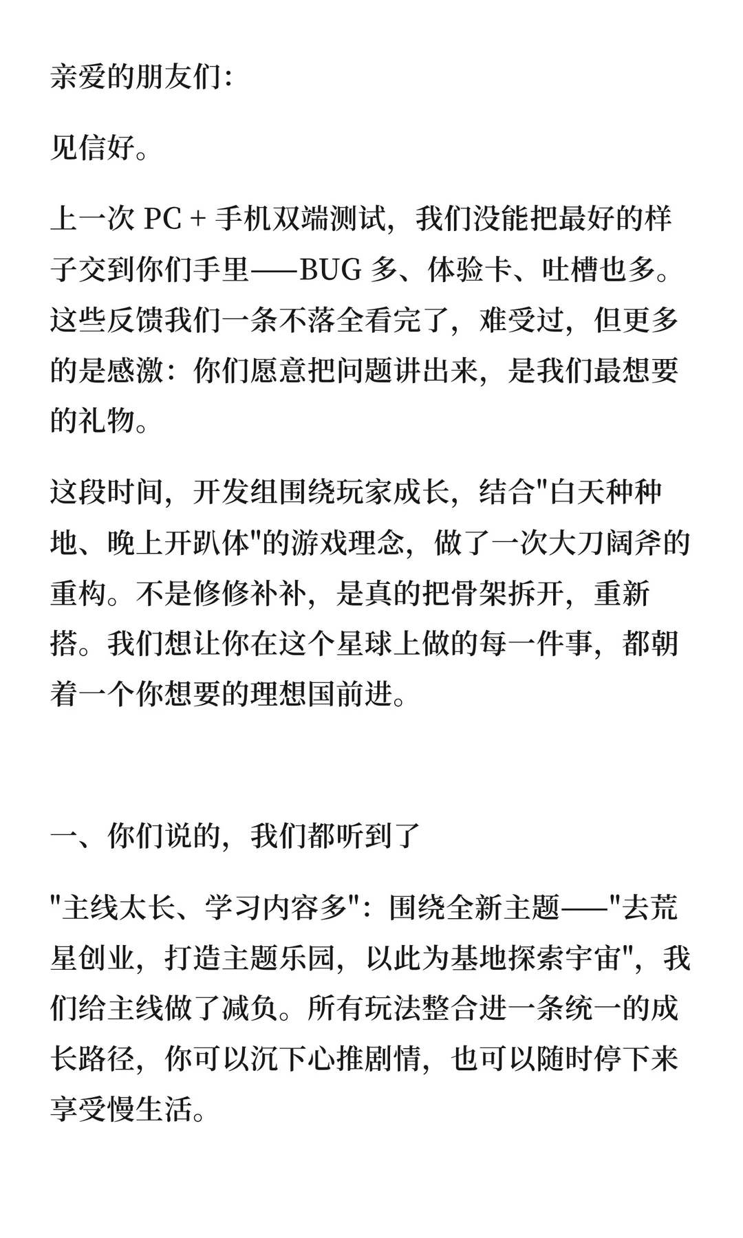 如果你有时觉得,生活需要一点乐趣—— 不如换一颗星球,重新开始! 网易全新宇宙生活模拟游戏《星绘友晴天》 PC先行版(Soft launch)今日开服! S0赛季「神州行」开启 在新星球,开启你的新生活! —— 白天种种地,晚上开趴体 —— 在这颗立方星上,只有最纯粹的快乐! 白天,开垦一块星际土地,种下奇奇怪怪、可可爱爱的作物,亲手把一片荒地变成温馨的家园; 夜幕降临,宇宙的快乐却不停歇,叫上你的朋友,去玩具星球开一场派对吧! 怎么样,亲爱的星星探险家,请带着这份《立方星游玩指引》,前往银河,领取你的专属星星吧! 为了欢迎各位“主理龙”,立方星上也举办着热闹的活动,还有诸多外观上新,千万不要错过~ 以下展示外观、飞船皮肤等,均可通过活动/幸运金币奖池免费获得。 —— 神州好河山,宇宙共观赏 —— S0赛季「神州行」,《星绘友晴天》联手全国20+文旅伙伴,将把神州大地的风貌搬进立方宇宙! 第一站:杭州 —— 开服不孤单,大家齐相伴 —— 开发龙们有好多好多话,想要和星星探险家们说,正因你们的存在,宇宙才焕发生机! 感谢500万来自地球各地的小龙们,我们将一起点亮立方宇宙的灯火。 开发龙们将在小红书/B站开启3天(4月28日-4月30日)的陪伴式直播;小红书平台也将开启激励计划与抽奖活动。一起分享在立方星的趣闻吧! 4月28日,与大家不见不散! 《星绘友晴天》融合了生活模拟与休闲派对玩法,将支持PC、移动多端互通。你将成为一颗立方星球的主理龙,白天种种地、晚上开Party! 立方星球有六个面,游戏中也有“六边形”玩法循环:探索-搜集-建设-养成-社交-创造,保证让您获得新颖的、有趣的游戏体验! |