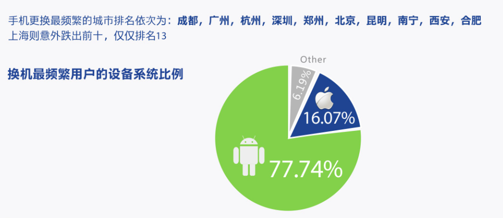 每月都买新手机 小学生主宰手机市场? 报告带给我们一些很有趣的统计,在被统计的用户中,有0.15%是传说中的“野生土豪”,在本年第一季度里,基本每月换一款手机,而有73.31%这样的土豪年龄分布在12-23岁!绝大部分频繁换机的用户都处于学生年龄阶段,某程度上说明了学生正在主宰这个“土豪市场”,20.66%的土豪处于24-35岁。实际上除了家庭经济压力不大让他们能够频繁更换手机以外,12-35岁的年龄层对于高新技术的接受程度较高龄用户要高得多,而更先进的移动设备能够满足他们产生的复杂需求,因而会选择“尝试”不同的手机。相对来说,高领用户群对于移动设备的需求不怎么高,普遍认为能够打电话就已经足够,因而也没有选择尝试更先进的机型。 成都最爱换机 转投IPhone怀抱 比较让人出乎意料的是,手机更换最频繁的城市前三是:成都、广州、杭州。北京排行第六,上海更是跌出前十,排名13,落后于昆明南宁等地。 也许是北京上海的学生们、白领们学业工作都太繁忙了,连手机都没有时间玩,谈何更换新手机?因而像昆明这样相对“休闲”的旅游城市都会榜上有名,看见如此秀丽的山水,玩玩手机拍拍照,不失为一件美事。 虽然有77.74%换机最频繁的用户设备系统是安卓,但是由于市场上安卓手机产品是实在是多如牛毛,这也是十分正常的。要换机,也要有新机才能换。反观有16.07%的IOS用户频繁换机,有点让人难以理解。毕竟IOS产品只有苹果一家,而苹果本身每年出的产品寥寥可数,不可能达到1个月换1次,更大的可能性是有不少安卓的用户转向使用苹果的手机。 值得一提的是,6.19%的其他用户在频繁更换手机,可能就是传说中的诺基亚粉丝。 WIFI让联网更持久 3G4G仍需努力 根据报告对用户联网时长作出的统计,用户们45.6%的时间选择使用WiFi联网。理由无他,目前国内能够自由连上互联网而不需要考虑流量问题的,就只有WiF连接这种方式了。出于用户对钱包状态的考虑,WiFi似乎是首选。而如果没有WiFi,则用户们24.4%的时间选择了离线,不使用互联网。在看看3G4G相对偏低的上线时间,看来移动网络供应商们要更努力普及新一代的移动互联网连接技术了。 IPad Mini逐渐成为大众产品 在2014年第一季度,最多人使用的是IPad2与IPad mini,并列达到IPad用户数的24%。IPad是12年出现的经典明星产品,至今仍然广泛被用户使用。而IPad mini 以更小巧的造型、更具竞争力的价格,作为IPad 系列高性价比作品出现,俨然已经成为大众化产品。而新产品Ipad Air 占12%,但本年1月活跃用户数增长了68%,后劲依然凌厉,可见苹果用户对新产品的吸收能力巨大。 男看快播女逛淘宝 社交休闲是永恒主题 在用户最爱玩的APP top10中QQ、微信、天天酷跑等著名应用均榜上有名。但若细分的男女性的使用的APP取向,就会发现男性与女性的取向十分不同。男生们最爱玩的APP是快播与视频软件,游戏视频美剧都能随时收看。而女生呢?则是淘宝与美图秀秀,看来逛街与自拍才是女生们永恒的主题。 游戏休闲乃用户最爱 而报告表明,在Q1安卓市场下载最多的APP类别排名前三分别是休闲、聊天与阅读。估计休闲类别下载最多的是游戏,而聊天与阅读紧随其后,可见国人的阅读习惯并非如想象中糟糕。男生十分喜欢的视频排名第四,视频应用占用流量太大,可能是收到移动网络的影响而没有较高的排名。 广东人民有图有真相 对于不同地域的用户来说,他们对APP的使用习惯也大不相同。广东人民最爱发图,其次是北京浙江江苏等地。而北京人民最喜爱发文本信息,广东辽宁紧随其后。然而,除了最爱发文本信息以外,北京人民也十分喜爱发视频,位居全国最爱发视频的群体第一,浙江第二广东第三。不难发现,北京、广东、浙江在三个榜单中均帮上有名,可见经济发达的地方人们也更倾向使用聊天APP。但奇怪的是,三个榜单均没有上海的身影,莫非上海人民都在发语音? 报告到此便告一段落了,虽然只是统计了14年Q1移动设备用户的各种情况。但在某程度上能够反映出目前国内移动设备用户的行为习惯与倾向趋势。 在国际市场上,三星的疲态已经开始显露,作为安卓系统最大的代表,似乎也未能挣脱走往下坡路的趋势。这是否意味着安卓系统正在如同诺基亚一样慢性死亡?新生代华为、小米等智能机制造商似乎为国内的安卓机市场带来了新的希望。特别以红米为代表,更低廉的价格,更高的性价比,开拓出独特的“低端高级市场”似乎能够带来新的安卓机系统变革。 然而,安卓机市场始终缺乏一个带领其前进的“灵魂”,中低端市场或许能在一段时间内保持安卓机的市场占有率。相信随着诺基亚加入微软移动,相信WP系统也将会加入这场IOS与安卓的对决,形成新的混战。安卓能否在未来挽回不断流失的应用程序开发者,保持APP市场的生命力,仍然是未知之数。 (更多游戏资讯请访问叶子猪游戏资讯中心:http://news.yzz.cn/) [编辑:亚硫酸不存在]