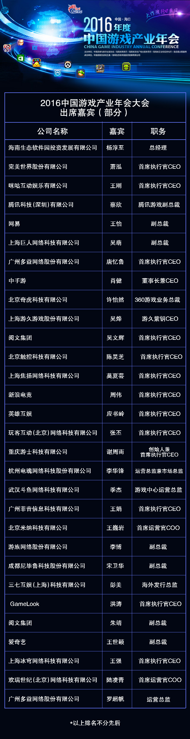 由国家资讯出版广电总局主管,中国音像与数字出版协会、海南省工业和信息化厅、海南省文化广电出版体育厅、海南省商务厅、澄迈县人民政府主办,中国音像与数字出版协会游戏出版工作委员会与海南生态软件园投资发展有限公司联合承办的2016年度中国游戏产业年会将于2016年12月14日至16日在海南省海口希尔顿酒店举办。 今年的年会主题是“大作随行e乘风”。寓意中国游戏市场应倡导创作为先、内容为王。游戏精品大作所制作的内容,引领互联网娱乐数字产业乘风破浪,不断优化升级,不断开拓进取,不断发展壮大。 年会将由产业年会高峰论坛、2016年度中国“游戏十强”盛典、国际商务大会海外专场等部分组成,国家相关部门领导,游戏厂商大佬,国内外游戏人将相聚本次盛会,共同回顾中国游戏领域这一年蜕变与发展。 产业年会高峰论坛,大腕云集 中国游戏产业年会高峰论坛是整个年会的核心部分,历年来,行业内各大游戏巨头皆曾在此开诚布公大方陈词,回顾过去历程,总结曾经经验,眺望未来发展。其中高峰对话部分更将现场展现行业知名人士就砥砺思想、激荡思维的盛况。今年的高峰论坛邀请到来自腾讯、完美世界、网易、阅文集团、游久游戏、奇虎360、巨人网络、触控科技、胜利游戏、英雄互娱、多益游戏、焦扬网络等诸多游戏企业齐聚海口,共续互联网游戏行业的发展新篇章。 同时,参会嘉宾将围绕“游戏国际化”、“电竞黄金时代”、“移动游戏未来”等议题展开对话,共同回顾过去一年大事记,展望新一年行业变化。 游戏十强颁奖盛典,亮点不断 中国“游戏十强”评选盛典被誉为第九艺术封神榜,评选旨在表彰本年度中国游戏产业涌现的卓越贡献企业家、优秀企业单位、各类游戏精品大作。典礼现场盛况空前,国家管理部门领导、行业协会领导、游戏企业等代表济济一堂,共同见证辉煌时刻,一展第九艺术封神榜之荣耀。此外,中国“游戏十强”评选盛典将通过各路媒体,包含电视、网络视频、手机视频、报刊、网站、微信、微博等在内的多种方式进行广泛传播,让更多行业人知晓中国游戏产业正不断加速发展。 国际游戏商务大会,专场等候 随着世界互联网构建的完善,人们之间的沟通和交流变得紧密,游戏行业的发展也将不可避免的趋向全球化,但是想要出海国际市场的厂商和想要引进国外游戏的代理往往苦于没有机会与国际同行进行交流。因此国际游戏商务大会将设立专场,安排一对一的形式为具备合作意向的双方提供专门交流平台。此前今年7月26日至27日于上海举办的国际游戏商务大会芬兰与英国专场也取得了圆满的成功,而本次大会将邀请来自韩国、印度、苏格兰和俄罗斯的游戏企业前来交流。活动势必将为年底中国游戏市场进一步国际化添上浓墨重彩的一笔。 历经12年12次举办,中国游戏产业年会已经成为我国游戏产业知名品牌活动,影响力覆盖全国,远播亚洲及国际,成为中国游戏产业总结经验、分析现状、规划未来的重要交流与合作的首要平台。为了共同促进我国游戏行业的交流与提升,在共聚一堂时共同规划游戏行业的未来发展,我们期待并欢迎您的加入。 |