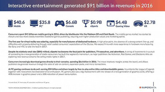 据外媒报道,知名数据机构SuperData近日发布了2016年游戏产业的数据报告。根据报告显示,2016年全球游戏产业的市场规模达到910亿美元,相比去年增长49%,其中移动游戏的市场规模达到406亿美元,占据全球近半份额,首次在市场规模上超越PC与主机平台。 SuperData指出,2016年推出的两大“全球爆款”《皇室战争》与《精灵宝可梦GO》是推动移动游戏市场份额超越PC的重要贡献者。他们也是2016年上市的移动游戏新品中“全球化”推进比较成功的产品。 不过他们并非2016年度最吸金的移动游戏。“全球化”相对不那么成功的《怪物弹珠》,几乎凭借其在日本市场的持续火热,拿下了2016全球手游收入冠军。这也意味着《怪物弹珠》正式将《部落冲突》从“全球手游吸金王”的宝座上拉下马。后者位列2016年度榜单的次席。 分列三至五位的依次是《皇室战争》、《战争游戏:火力时代》和《雷霆天下》。 |
