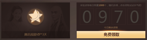 听说今天大家都在渡劫(三八节),腾讯游戏心悦俱乐部为广大腾讯游戏玩家送来附带伴你渡节! l 活动时间:活动上线之日~2017年3月24日 【福利一】腾讯视频VIP*3天,免费领取。(每天限量1000份) 1、限心悦会员&游戏家L4领取。 2、免费领取腾讯视频VIP体验资格3天,活动期间单Q限领一次。 3、体验资格每日限量一千个。进入页面点击【领取】随机发放。 【福利二】开通腾讯视频VIP专享折扣+返Q币红包。 1、在本活动页面领取到腾讯视频VIP试用资格,并在本活动页面开通腾讯视频VIP,可获得Q币红包一个。 2、拆开红包可随机获得1~100Q币,活动期间单Q限领一次。 3、在本活动页面开通腾讯视频VIP专享9.5折优惠。 *腾讯在法律规定的范围内享有本活动最终解释权 |