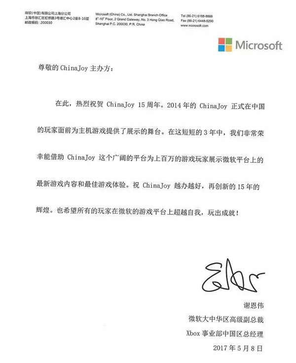 以“同行十五载,共享泛娱乐” 为主题的第十五届ChinaJoy将于2017年7月27日至7月30日在上海新国际博览中心举行。值此盛事,海内外众多业界领袖与知名厂商高管纷纷发来不同形式的贺词,以表达对ChinaJoy十五周年的衷心祝贺与鼎力支持。 作为世界级的科研、产品开发与技术支持服务机构与世界PC软件开发的先导,微软近日向ChinaJoy主办方发函道贺——微软资深副总裁、大中华区董事长兼首席执行官柯睿杰(Alain Crozier)先生特地录制了视频,对ChinaJoy十五周年表示衷心祝贺! 微软资深副总裁、大中华区董事长兼首席执行官柯睿杰(Alain Crozier)先生祝贺ChinaJoy十五周年 与此同时,微软大中华区高级副总裁、Xbox事业部中国区总经理谢恩伟先生也特地致辞,祝贺ChinaJoy十五周年——在此,ChinaJoy主办方汉威信恒非常感谢柯睿杰(Alain Crozier)先生和谢恩伟先生对ChinaJoy展会的衷心祝贺,并由衷感谢微软公司多年以来对ChinaJoy的大力支持! 微软大中华区高级副总裁、Xbox事业部中国区总经理谢恩伟先生祝贺ChinaJoy十五周年 目前,2017 ChinaJoy招商活动仍在继续。微软、索尼互动娱乐、网易、暴雪、腾讯互娱、万代南梦宫、阿里游戏、EA、UBISOFT、盛大游戏、完美世界、空中网、巨人网络、西山居、心动网络、三七互娱、蜗牛数字、4399、JJ比赛、凯撒文化、多益网络、游卡桌游、顺网、乐逗游戏、盖娅互娱、欢聚游戏、bilibili、电魂、AcFun、Intel、戴尔、联想、惠普、华硕、HTC、AMD、NVIDIA、技嘉、金士顿、希捷、美商海盗船、森海塞尔、东芝、西部数据、熊猫直播、触手、全民直播、战旗直播、游戏风云、欢朋手游直播、360游戏、畅游、搜狗、炎龙、掌趣科技、百度游戏、蓝港互动、UNITY、龙图游戏、星辉游戏等国内外知名游戏产业巨头现也已确定将亮相2017ChinaJoy,与他们并肩同台的机会正在眼前——同行十五载,共享泛娱乐,2017第十五届ChinaJoy热烈欢迎您的加入! |