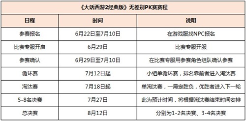 全民齐见证,热血共燃烧!《大话西游2经典版》无差别PK赛震撼来袭,7月12日即将火热打响!在这个公平竞技舞台上,你可以发挥无限制奇妙战术,体验无差别巅峰对决,赢取超级现金大奖、高价值荣耀戒指、十五周年绒沙金鸡驴公仔以及丰厚游戏内奖励!此外,新服【锦瑟年华】今日火热开启,虚席待君至! 给你舞台,全民来战!无差别PK赛一触即发 配置无差别,战术显本领!《大话西游2经典版》无差别PK赛一触即发,7月10前,已成功报名的玩家需登陆比赛专服【英雄会】进行参赛确认以及账号配置,还可在切磋场进行切磋。 本次比赛赛程安排如下:循环赛将于7月12日开启,淘汰赛将于7月18日开启,5-8名决赛将于7月27日开启,这三个阶段均为线上赛,线下总决赛将于8月12日进行,届时将现场决出冠亚季殿军,争夺冠军荣耀和20万元现金大奖! 新服【锦瑟年华】火热开启 2017嘉年华邀你情义一聚 《大话西游2经典版》新服【锦瑟年华】今日中午12点火热开启,虚席待君至,与你共赴江湖路!2017嘉年华将于8月12日至8月13日在广州举行,邀你情义一聚,等级≥3转的玩家可在游戏中的“多宝商城-综合-嘉年华”处购买门票礼包,内含嘉年华入场券,以及小糖果*4、宝石精华*7、珍珠水泽丸药盒*2以及实物鸡驴挂件*1。 |