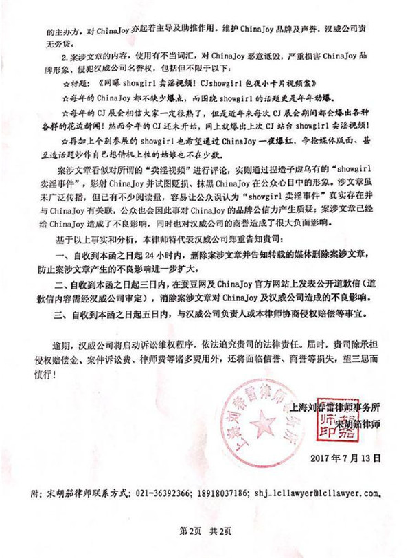 以“同行十五载,共享泛娱乐”为主题的第十五届ChinaJoy即将于2017年7月27日至7月30日在上海新国际博览中心举行。作为产业链条上极为重要的一环,广大媒体对ChinaJoy的展会宣传与品牌推广长期发挥着重要作用;而2017年恰逢ChinaJoy十五周年,由此,ChinaJoy组委会及主办方上海汉威信恒展览有限公司(以下称:汉威公司)一直不忘迎合产业发展大潮,引领泛娱乐潮流,展示高科技泛娱乐产品,并秉持着坦诚开放的态度与广大媒体积极开展各种形式的合作,众多媒体对于ChinaJoy的品牌价值亦表示高度认同。 自首届ChinaJoy举办以来,汉威公司一直致力于打造最专业、最具国际影响力的游戏和泛娱乐产业平台。众所周知,长久以来,为贯彻落实国家主管部门关于“抵制低俗”、营造良好展示氛围的指示精神,ChinaJoy组委会也一直致力于从严监督展会现场秩序,出台了一系列旨在加强展会现场安全监管、提供良好服务、特别是针对展品内容和现场低俗炒作的规章和管理制度,先后与专业展台搭建监理公司合作进行展前、展中的施工搭建监理,为展会现场的安全保驾护航;并在主管部委领导的直接领导下,成立以游戏工委牵头专家为主要成员的参展产品专家审读小组,对参展游戏产品进行展前审查和展会现场监管;更为重要的是,为落实组委会关于展会现场模特、Showgirl演出严格管理的要求,汉威公司会同新丝路(北京)文化传播有限公司共同制定一系列关于模特、Showgirl展会现场着装、行为、演出内容的管理规定,并在展会现场进行严格的监督管理。 然而当ChinaJoy展会开幕在即,各界观众与汉威公司共同喜迎ChinaJoy十五周年之际,5月26日,“蚕豆网”微信公众号(微信号:candouwang)刊载《网曝showgirl卖淫视频!CJshowgirl包夜小卡片视频案》一文(并于次日被另一微信公众号“红主播(微信号:icelebirty888)”(下称:红主播)转发),凭空捏造虚假事实,对ChinaJoy进行恶意诋毁,看似对所谓的“卖淫视频”进行评论,实则通过描述未经证实的“showgirl卖淫事件”,影射ChinaJoy并试图贬损、抹黑ChinaJoy在公众心目中的形象,误导公众认为“showgirl卖淫事件”真实存在并与ChinaJoy有关,引发众多不明真相网友的阅览,导致公众因此质疑ChinaJoy的品牌公信力,严重损害ChinaJoy品牌形象,同时严重侵犯了汉威公司名誉权,给ChinaJoy造成了极坏影响。 作为ChinaJoy主办方,汉威公司对维护ChinaJoy品牌声誉责无旁贷。针对蚕豆网微信公众号及红主播微信公众号此般严重违反资讯道德的举动,汉威信恒出于维护自身正当权益,特委托ChinaJoy品牌法律顾问单位——上海刘春雷律师事务所对此进行法律介入,完成证据收集和整理工作,并于近日向蚕豆网微信公众号及红主播微信公众号的运营主体:千钧万博(北京)信息技术有限公司、千钧万博(武汉)移动技术有限公司发出《律师函》,要求蚕豆网微信公众号及红主播微信公众号迅速删除涉嫌侵权的稿件,并就此公开发表道歉信,与汉威公司协商侵权赔偿事宜。否则,汉威公司将启动诉讼程序,依法维权并追究其法律责任! 作为一场举世瞩目的泛娱乐盛宴,ChinaJoy伴随并见证了业界的发展和繁荣,早已形成了巨大的行业号召力,影响覆盖海内外,深受业界人士和广大玩家的支持和喜爱,由此受到了各方媒体的热切关注。诸多知名媒体都先后与ChinaJoy建立合作关系,其中不乏众多极具社会影响力的传统媒体及业界知名的游戏、动漫、VR、智能硬件等行业媒体;各家媒体通过自身优势为ChinaJoy开展了全面的传播与报道,有效扩散了ChinaJoy的受众覆盖度与品牌影响力,共同推动泛娱乐产业在中国的健康发展。但是,少数媒体出于自我炒作、吸引关注的动机,置职业道德、社会影响于不顾,肆意散布不负责任的虚假信息,炮制八卦资讯和吸睛话题进行低俗炒作和所谓“热点营销”,不断出炉一些涉及以ShowGirl为主的各类演职人员的负面讯息及评论在社会上流传,致使ChinaJoy展会多次无端遭受牵连,莫名蒙受不白之冤,主办方对此深表遗憾。 为树立正面的舆论导向,营造正面的舆论环境,积极宣扬正能量,汉威公司作为ChinaJoy主办方,将对涉及ChinaJoy的一切相关报道进行严格监督,针对媒体的不实报道、虚假宣传、低俗炒作等导致ChinaJoy大会品牌受损的情况一旦出现主办方将积极通过法律途径予以维权!此外,如有涉及到展会期间关于showgirl、模特、Coser及演职人员的恶意炒作,当事人所在的ChinaJoy指定经纪公司也将承担连带责任!汉威公司在此还望有关媒体认真调查了解真实情况,更好地承担资讯媒体的社会责任,从积极推动中国泛娱乐产业发展的角度,注重资讯报道的客观性,将其不实报道纠错更正,消除影响,以正视听,让别有用心的行为与言论不攻自破,还广大玩家、厂商、业界人士一个朗朗乾坤! 最后,ChinaJoy主办方再次强调:凡有任何组织机构或个人擅自凭空捏造与ChinaJoy真实状况严重不符的信息;诽谤、诋毁ChinaJoy展会及同期会议演讲嘉宾名誉;发布并传播影响ChinaJoy品牌口碑的报道,ChinaJoy主办方将以零容忍的严正态度,对发布报道的单位或组织机构以及协助散播不实报道的组织机构或个人,依法追究其法律责任——由此产生的法律上一切不利后果,全部由责任方承担! 特此声明! 欲了解更多详情,请访问ChinaJoy官方网站,也可搜索微信公众订阅号“ChinaJoy”或扫描以下二维码关注ChinaJoy官方微信公号。 ChinaJoy官方网站 http://201