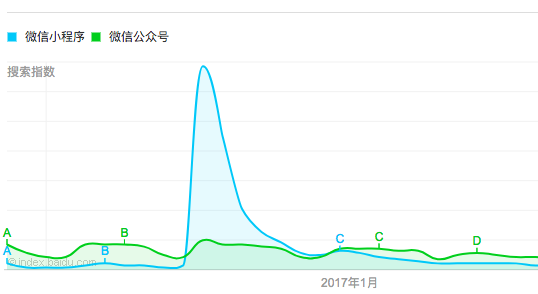 1月9日,小程序正式上线,“微信小程序”的百度指数也坐上了过山车,达到惊人的27万+,是前一天指数的45倍、同一条“微信公众号”指数的7倍之多。