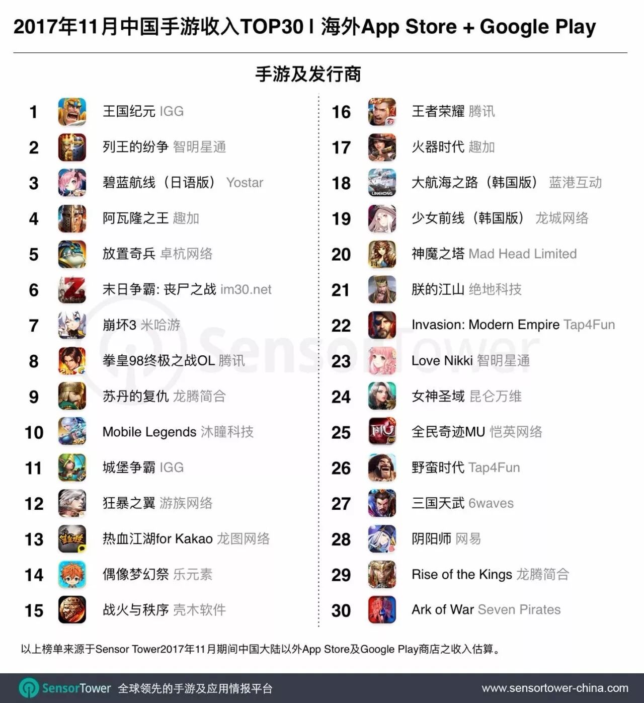 根据对Sensor Tower商店情报Store Intelligence平台最新数据的分析,这篇报告中揭露了2017年11月期间,哪些国产手游作品收入及下载量在中国大陆以外的海外App Store及Google Play商店中,出海收入及下载量成绩卓越,排名前30强。我们的分析发现,IGG及网易旗下的《王国纪元》和《Rules of Survival》分别引领11月海外收入及下载量TOP30榜单,美国同为这两款冠军作品的主要海外市场。同时,分别有25家及23家中国公司出品的手游上榜海外收入与下载量TOP30。这些中国游戏公司所推出的作品所针对的市场也各有不同,从日韩、中东、东南亚、到西方各市场如美国、俄国、德国,等等。
