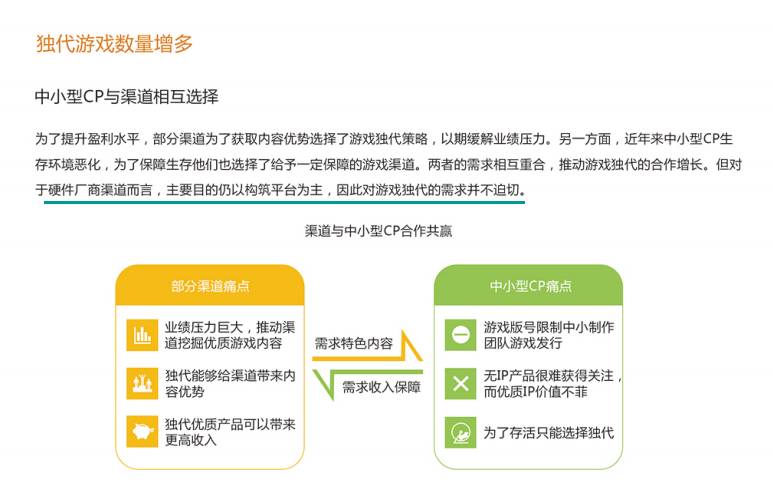 1.硬核厂商仍以构筑平台为主,对独代需求不迫切: 近年来部分渠道为了获取内容优势选择了游戏独代策略以缓解业绩的压力,而硬核厂商的主要目的仍以构筑平台为主,对游戏独代的需求并不迫切。意味着只要游戏厂商能够为硬核联盟的用户提供足够优秀的内容,就能够获得推荐。 无论是对市场还是对应用渠道本身而言,多样化的游戏品类才是保持其繁荣健康的核心。