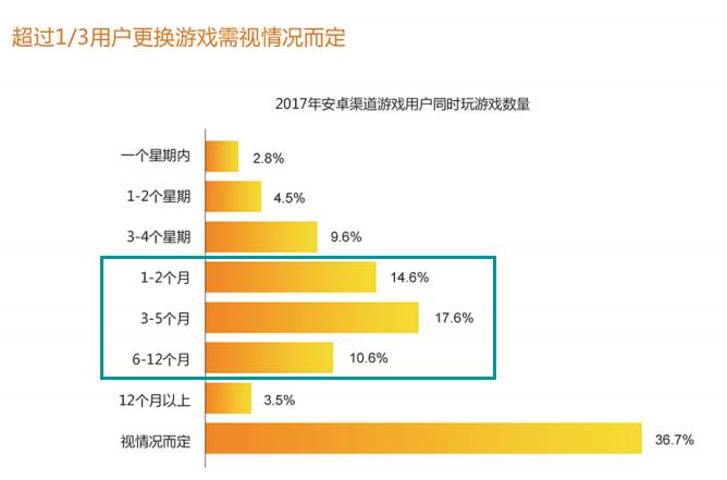 而从用户的游戏更换情况来看,59.7%的用户会在一年内换游戏,仅有3.5%的用户能够持续玩超过一年的时间。爆品总会更迭,谁能够在下一次换游潮来袭的时候抓住机会?