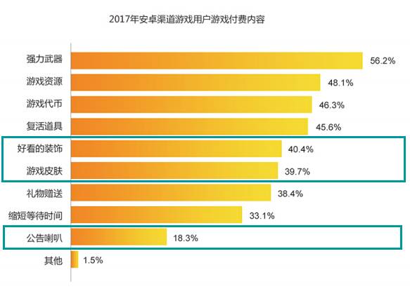 安卓渠道游戏用户的付费习惯中,强力武器、游戏资源、游戏代币和复活道具依然是最能驱使玩家付费的内容。不过值得注意的是, 好看的装饰和游戏皮肤两项“华而不实”的内容也有近40%的用户为止付费,礼物赠送和公告喇叭这两项提升社交互动的内容有额分别有38.4%和18.3%的用户付费。