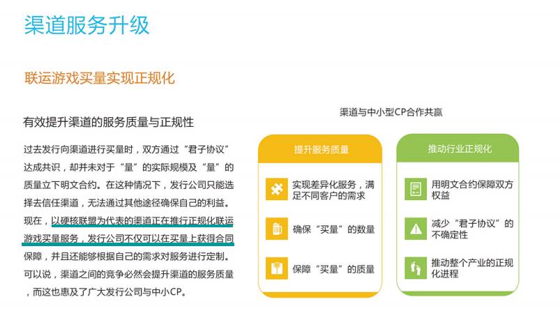 2.推行正规化联运买量服务: 以硬核联盟为代表的渠道正在推行正规化联运游戏买量服务,解决了一直以来买量不透明的问题,同时实现差异化服务,满足不同客户的需求,提升了服务质量。这样一来,发行公司不仅可以在买量上获得合同保障,并且能够根据自己的需求对服务进行定制。