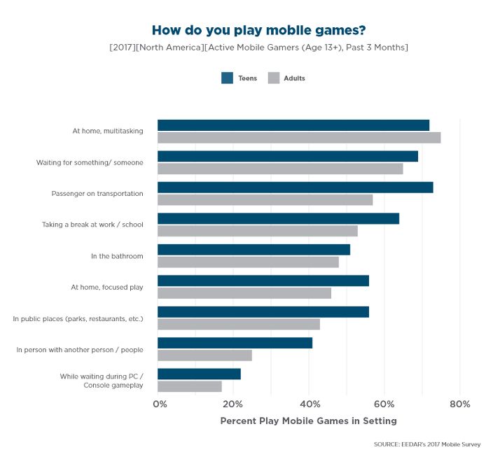 EEDAR的数据基于对3000名活跃北美(美国和加拿大)成年移动游戏玩家和1000名活跃青少年(年龄介于13-17岁之间)移动游戏玩家的一次问卷调查报告,对青少年和成年玩家在游玩习惯、喜好等方面的差异进行了研究。
