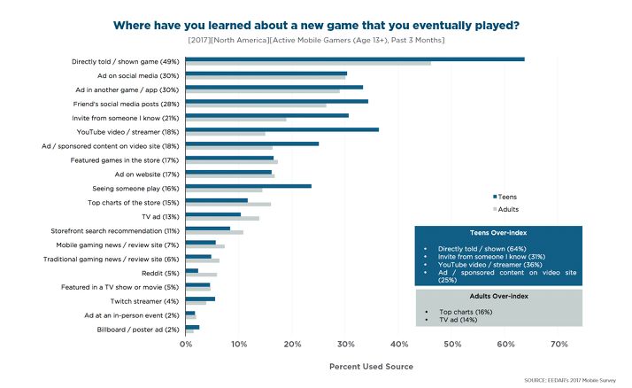 与成年玩家相比,青少年玩家发现移动游戏的渠道大不一样。他们更有可能口碑传播、朋友在社交媒体上的分享、朋友的直接邀请、YouTube视频等社交渠道发现一款游戏。