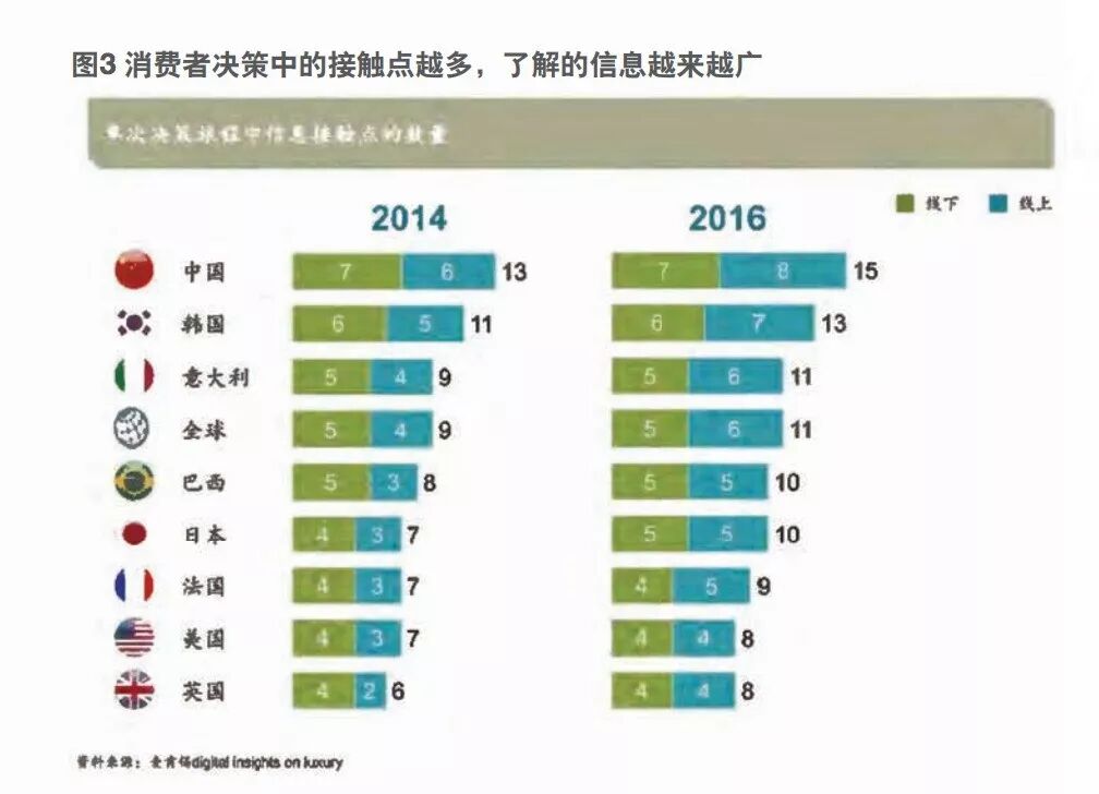 趋势四:信息扁平化。 随着科技的发展,消费者和品牌的接触点越来越多。这一点在中国消费者身上体现得尤为明显。根据麦肯锡2017年奢侈品调研,中国消费者在单次决策旅程中平均要经历15个信息接触点,包括7个线下触点和8个线上触点。