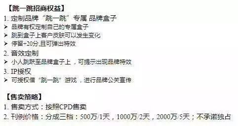 据 PingWest品玩 报道,昨天 (3月13日) ,几张疑似微信小游戏“跳一跳”的广告招商图在网上流出,图片显示,品牌可以通过在“跳一跳”中定制自己的盒子,在盒子上展现品牌特效、定制特定的音效等方式进行公关宣传。同时,“跳一跳”广告按CPD (Cost Per Day,按天计价) 进行售卖,一天500万,两天1000万,五天2000万,而且不承诺独占。