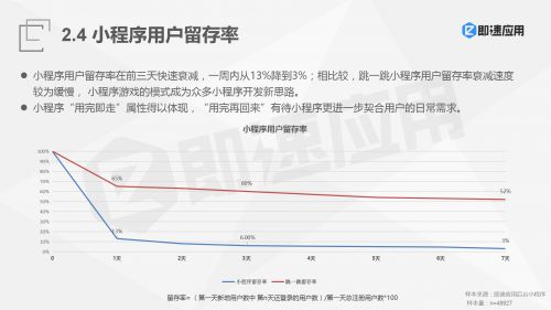 日前, 2018微信小程序报告 指出,小程序整体用户留存率在前三天快速衰减,一周内从13%降到3%。 但是,“跳一跳”小程序的用户留存率则要高出很多,整体衰减速度较为缓慢,到第7天留存率依然高达52%。