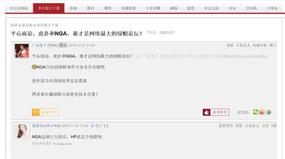 绿帽社在绿油油的道路上从来不是孤军奋战,NGA和虎扑步行街一直是它的“亲密战友”,网友甚至为了后两者“谁才是国内最大绿帽论坛”而开贴争论。