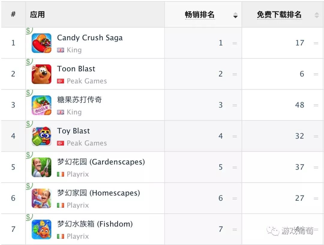 不过 King 在三消手游领域中的地位并非无法撼动。俄罗斯手游厂商 Playrix 在近年俨然成长为能够与 King 分庭抗礼的竞争者。该公司虽然也以三消手游作为主打,但旗下产品《梦幻花园》、《梦幻家园》等在玩法上做到了差异化。两款游戏以三消+模拟经营的新颖形态赢得市场的青睐,成功进入益智手游的第一梯队,并一度将《糖果传奇》的排名挤下。