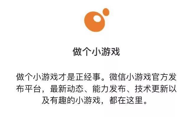 这是小游戏官方微信,所有关于小游戏的消息都会是在这里发布第一手消息,包括政策、广告接入等等。微信派、公开课等关于小游戏的政策也都是转发这里的内容。也可以通过这个渠道与小游戏取得联系。