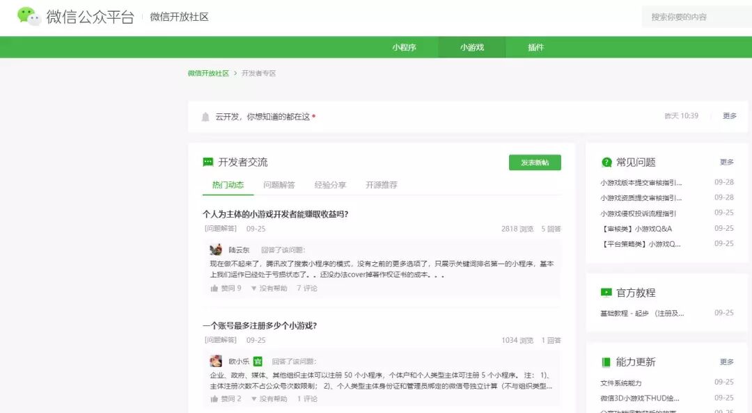 据我们了解,微信开放社区中的开发者专区是微信小游戏团队每日都有专人维护的地方,这也是最直接能够与官方沟通和交流的地方。