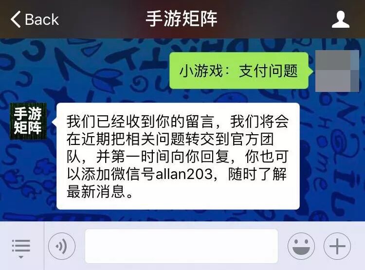 手游矩阵从小游戏发布一直保持持续的关注,并且也与微信小游戏、QQ轻游戏官方取得联系,在一定的程度上也可以帮助小游戏开发者提出意见和建议, 并且反馈给开发者。找我们留言的方式很简单,比如说添加微信号:allan203,或者直接在后台留言,留言模板如下: